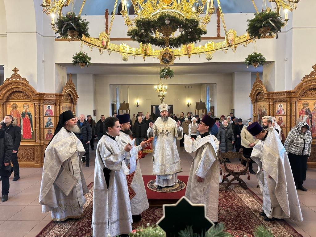 За праздничным ночным богослужением Архипастырю сослужили: ключарь кафедрального собора иеромонах Никодим (Авдеев), клирик собора иерей Роман Подрезов, протодиакон Андрей Дудник, секретарь епархии диакон Илия Кван, диакон Кирилл Рамазанов. Песнопения великого праздника Рождества исполнял хор Андреевского собора под управлением регента Н. Романцовой.