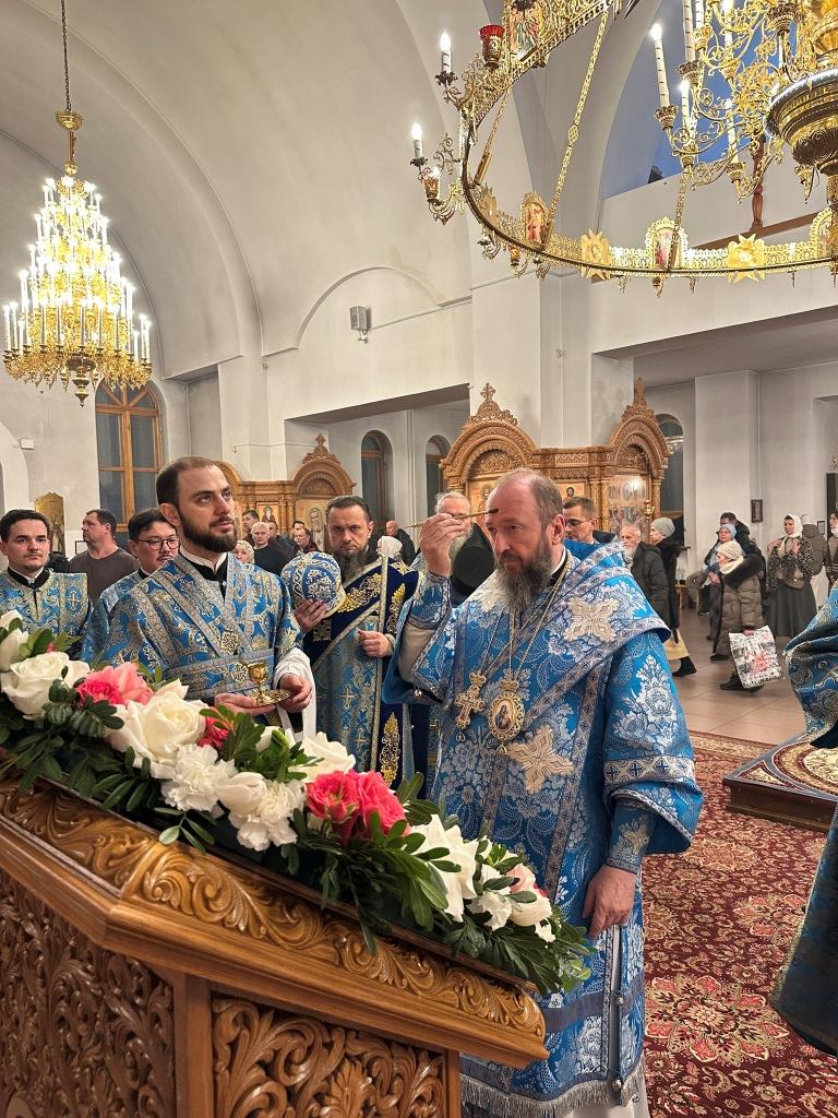 Песнопения праздничного вечернего богослужения исполнял хор Андреевского собора под управлением регента Н. Романцовой. За богослужением молились прихожане собора, насельники Свято-Троицкого мужского монастыря города Усть-Каменогорска и сотрудники епархиального управления. После чтения праздничного евангельского зачала архиепископ Амфилохий помазал клир и народ Божий освященным елеем.