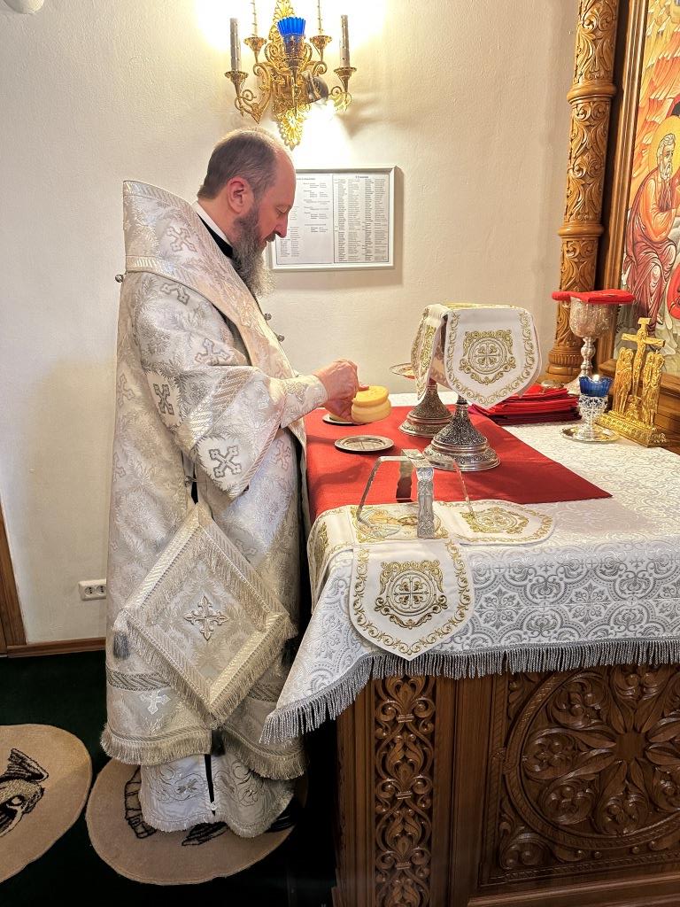 После Божественной Литургии была совершена лития с освящением хлеба и вина в память о том, как древние христиане, оставаясь в храме после Литургии до Пасхальной утрени, вкушением освященных хлеба и вина подкрепляли себя на подвиг бдения в грядущую пасхальную ночь.