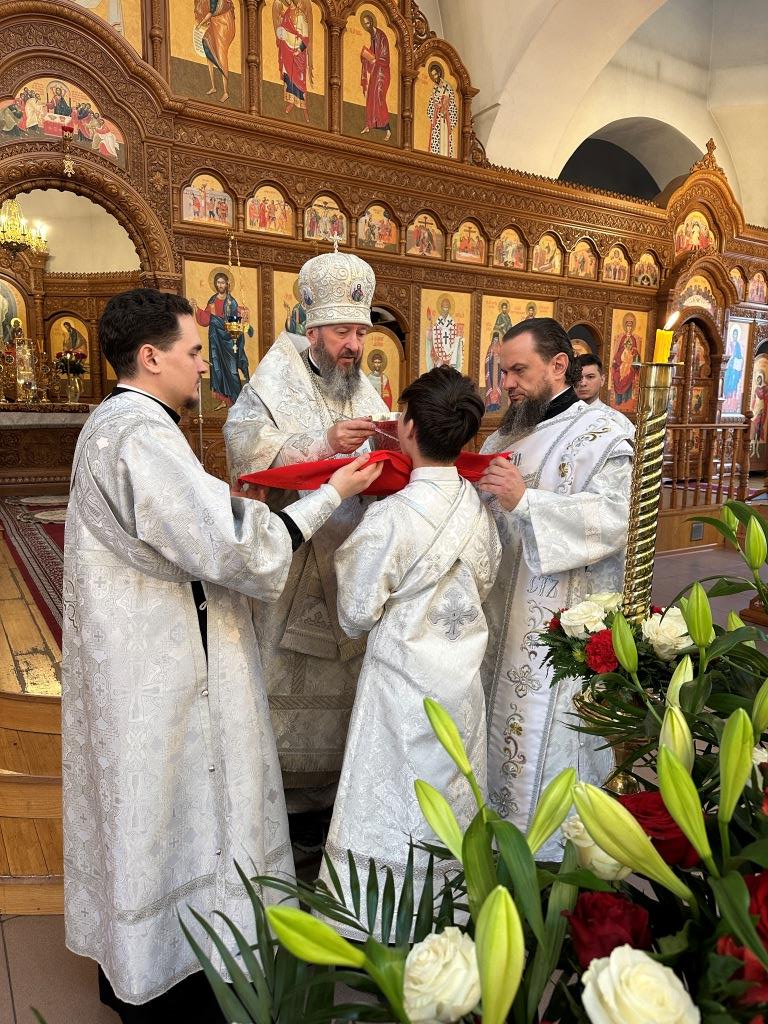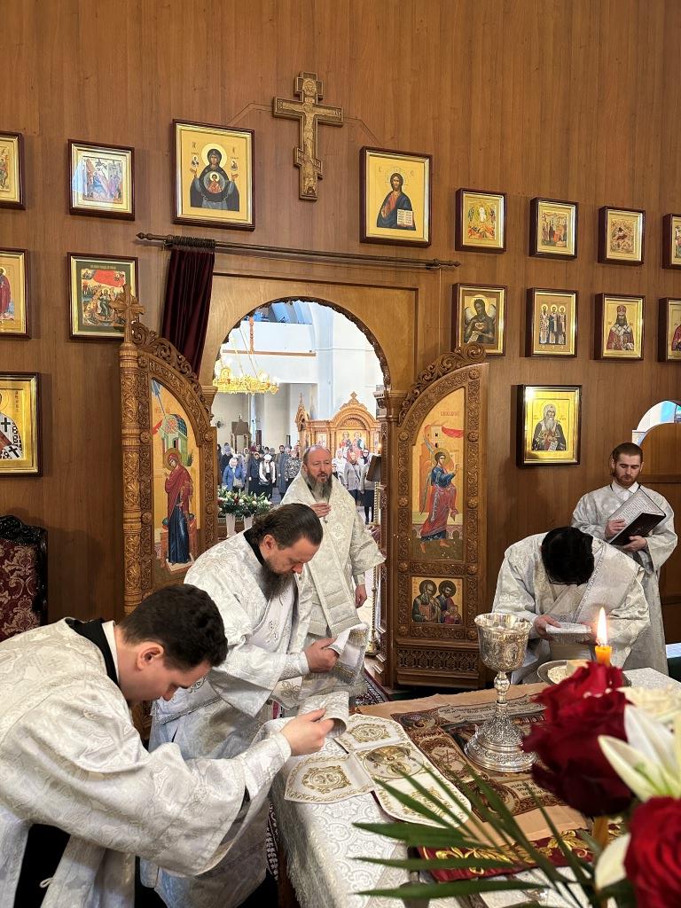 За богослужением были прочитаны паремии, в которых заключаются прообразы страданий, смерти и воскресения Христа и пророчества о наступлении благодатного Царства Господа и славы Новозаветной Церкви. По традиции, после чтения апостольского зачала, Архипастырь и клирики переоблачились, сменив темные великопостные ризы на праздничные белые.