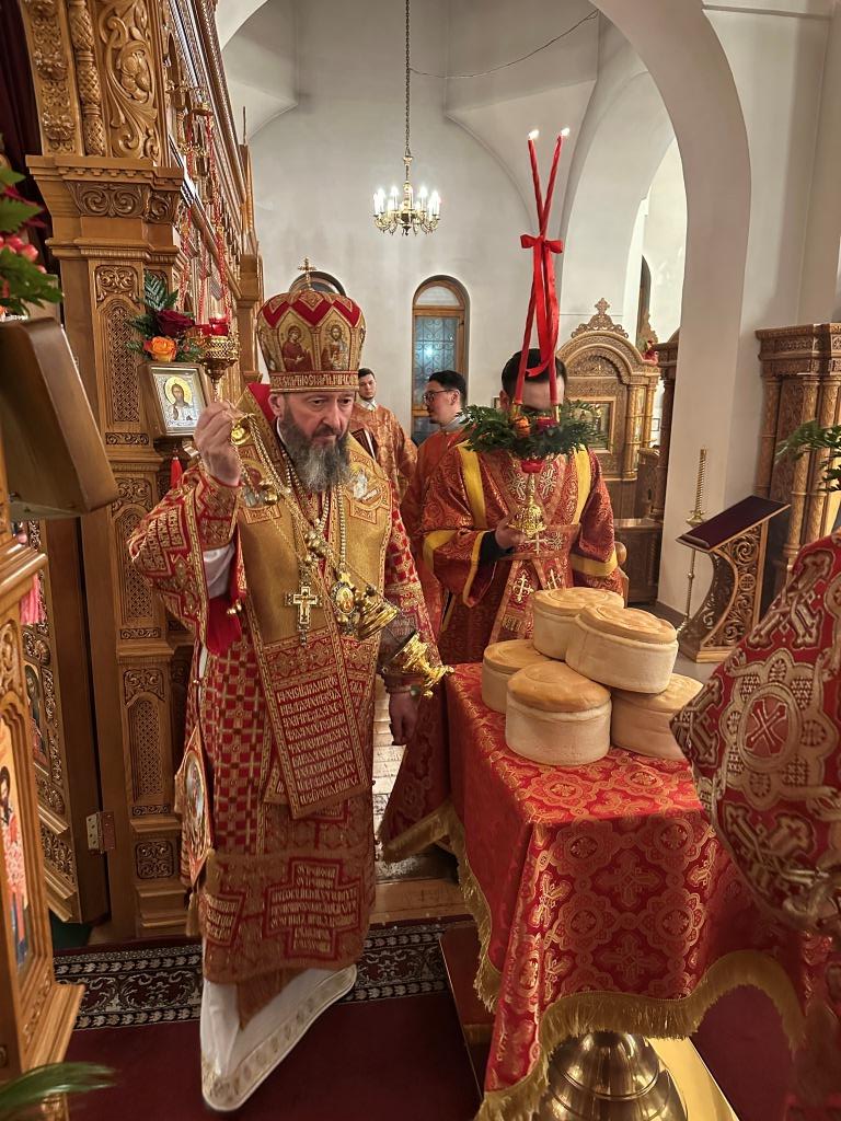 В завершение Богослужения Владыка Амфилохий освятил пасхальную трапезу: крашеные яйца, пасхи и куличи.