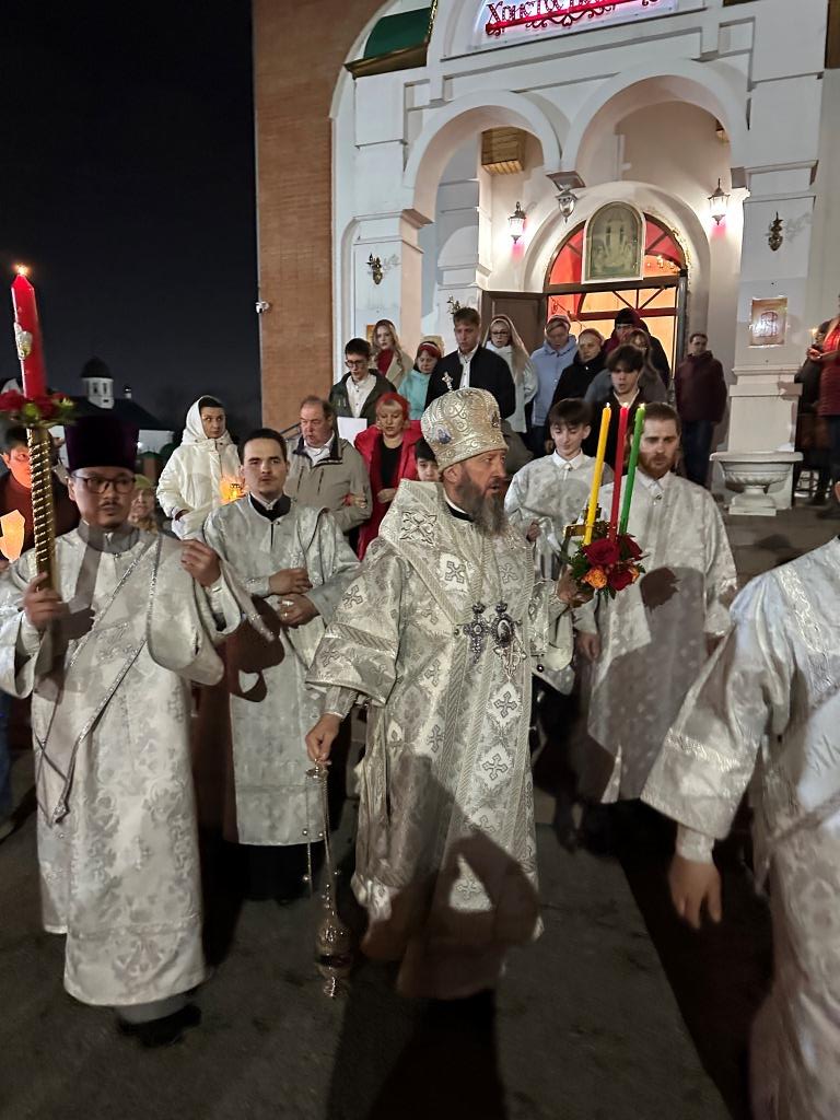 После пения канона и стихир Пасхи священник Константин Дьяков прочитал Слово огласительное святителя Иоанна Златоуста, в котором все христиане призываются в святую пасхальную ночь насладиться светлым торжеством и войти в радость тридневно Воскресшего Господа. Утреня завершилась пением пасхальных часов, после которых началась праздничная Божественная Литургия. За Божественной Литургией было оглашено Пасхальное послание митрополита Астанайского и Казахстанского Александра. После заамвонной молитвы архиепископ Амфилохий освятил артосы, и обратился к народу Божию со словами пасхального приветствия, в котором поздравил всех с великим торжеством Воскресения Господа Бога и Спаса нашего Иисуса Христа.