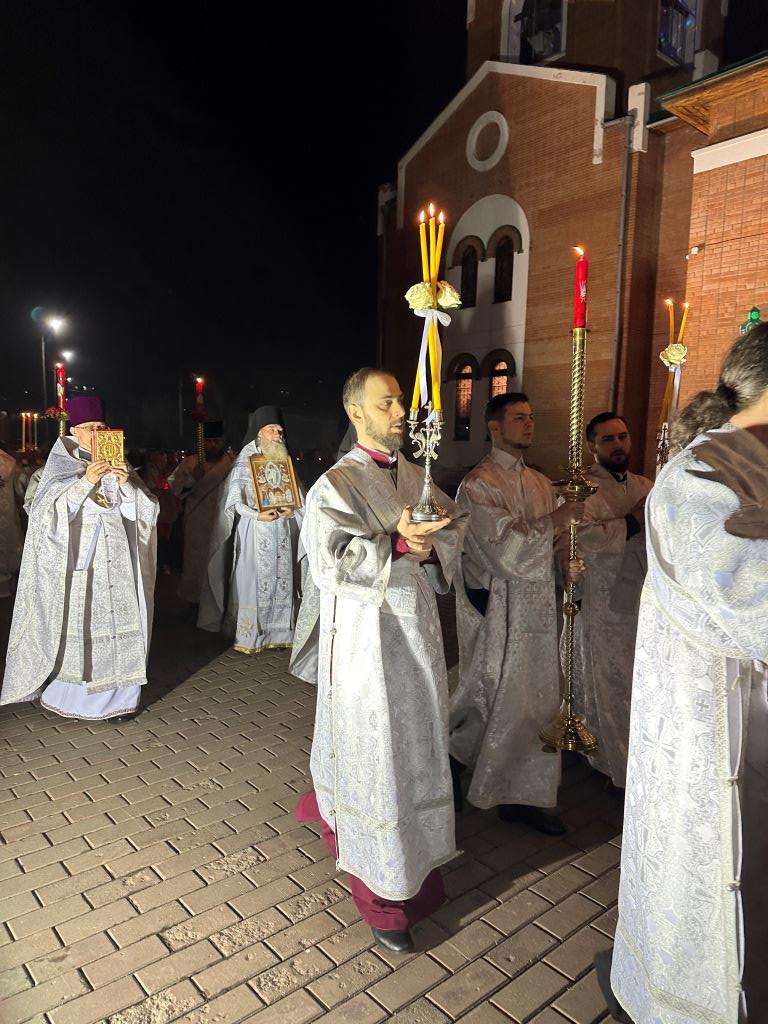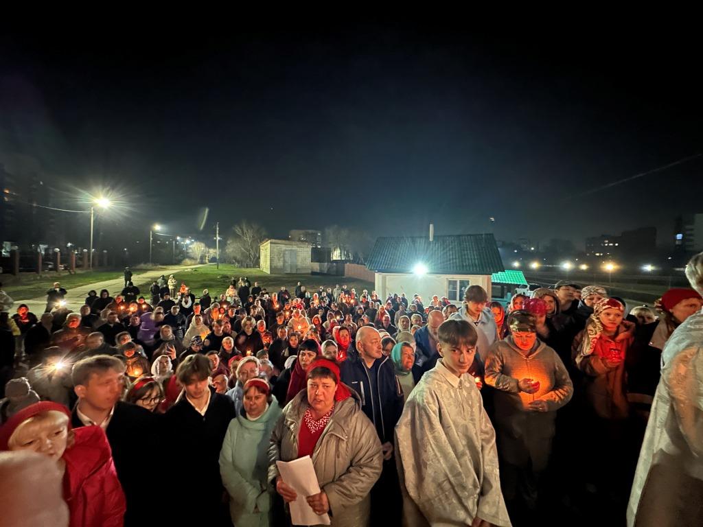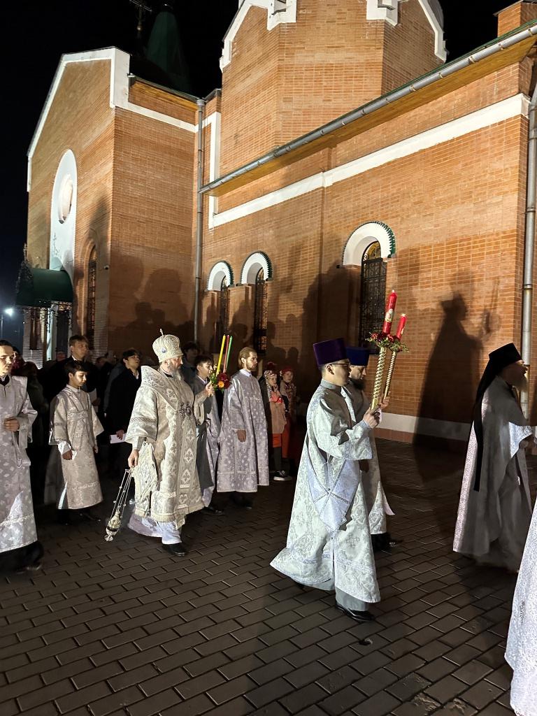 Ровно в полночь, под колокольный звон и пение стихиры «Воскресение Твое, Христе Спасе», был совершен крестный ход. Богослужение продолжилась пением пасхального канона. Пасхальные песнопения исполнял хор кафедрального собора под управлением Н. Романцовой. За богослужением молились прихожане и паломники главного храма Восточного Казахстана, сотрудники епархиального управления, насельники Свято-Троицкого мужского монастыря города Усть-Каменогорска.