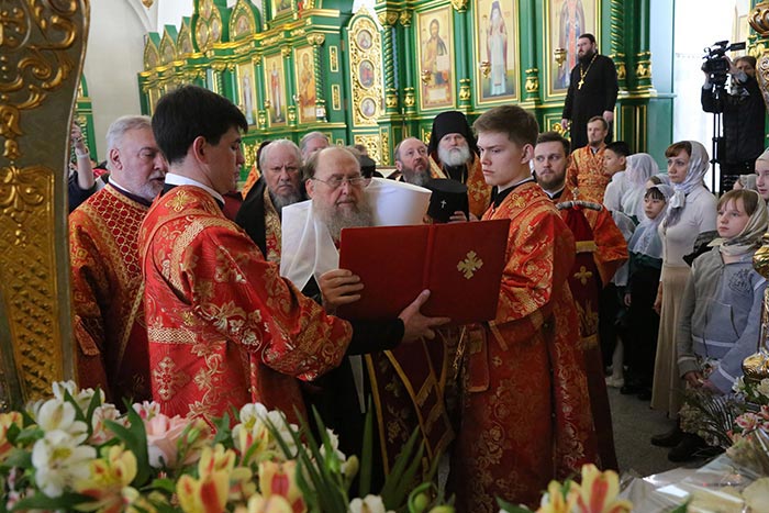 В завершение Литургии состоялось славление светлому Христову Воскресению и старцу Севастиану, после чего владыка произнес возглас «Христос воскресе!» на разных языках – древних и современных.