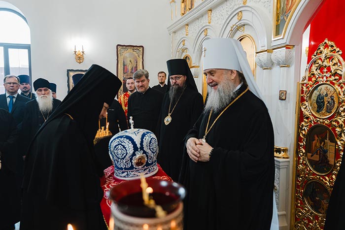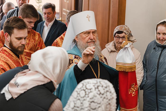 Игумения Варвара поблагодарила митрополита Александра за архипастырский визит и святые молитвы. На память о богослужении матушка преподнесла иерарху митру.