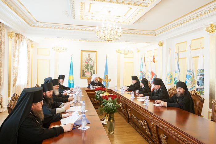 Глава Казахстанского Митрополичьего округа приветствовал Преосвященных владык вступительным словом и огласил повестку заседания. Главной темой встречи иерархов стало обсуждение программы торжеств, посвященных 1000-летию преставления равноапостольного князя Владимира, которые пройдут в течение юбилейного года в Казахстане. Основным мероприятием празднования должно стать принесение в епархии Митрополичьего округа ковчега с мощами равноапостольного Крестителя Руси. Кроме торжественных богослужений в главных городах епархий, в рамках прибытия мощей должны пройти встречи епископата с региональным руководством, лидерами традиционных конфессий страны и общественных организаций. Кульминацией торжеств должна стать Божественная Литургия в главном храме Митрополичьего округа – Успенском кафедральном соборе Астаны и торжественный акт в духовно-культурном центре столицы имени равноапостольных Кирилла и Мефодия с участием всего епископата Казахстана, представителей духовенства, монашествующих, мирян, лидеров епархиальных и приходских молодежных организаций, преподавателей и учащихся воскресных школ и православных братств из всех епархий. По общему мнению епископата Митрополичьего округа в течение всего 2015 года необходимо во всех епархиях Казахстана провести выставки, концерты, конференции, круглые столы, презентации культурно-просветительских проектов, тематические уроки в воскресных школах для детей и взрослых, организовать показ широкому кругу зрителей фильма о святом князе Владимире. Для ознакомления как можно большего количества людей с жизнью и уникальной ролью благоверного князя Владимира в становлении христианской цивилизации, необходимо растиражировать брошюры и информационные листки, содержащие исторические справки о святом князе Владимире и Крещении Руси, а также послание Святейшего Патриарха Кирилла в связи с 1000-летием преставления святого равноапостольного великого князя. Глава Митрополичьего округа проинформировал Преосвященных архипастырей о состоявшейся 16 апреля 2015 года закладке храма во имя равноапостольного благоверного князя Владимира в микрорайоне Алатау города Алма-Аты, приуроченной к 1000-летию со дня преставления святого Крестителя Руси. Иерархи выступили с информацией о запланированных юбилейных мероприятиях во вверенных их управлению епархиях. 2015 год ознаменован важным событием — 70-летней годовщиной Победы в Великой Отечественной войне. На каждом приходе всех епархий Митрополичьего округа 9 мая молитвенно будет отмечаться этот всенародный праздник: пройдут заупокойные богослужения о «вождех и воинех наших, на поли брани жизнь свою положивших, от ран и глада скончавшихся, в пленении и горьких работах невинно умученных и убиенных, и всех Победы ради потрудившихся» и будут отслужены особые благодарственные молебны Господу Богу за дарование Победы в Великой Отечественной войне 1941-1945 годов. В местах, где существуют мемориалы и памятники павшим воинам и труженикам тыла, священнослужители и прихожане храмов возложат цветы. Во всех приходских воскресных школах состоятся тематические уроки, посвященные Великой Победе и встречи с ветеранами. Также в ходе совещания обсуждалось празднование 60-летия блаженной кончины священноисповедника Николая, митрополита Алма-Атинског