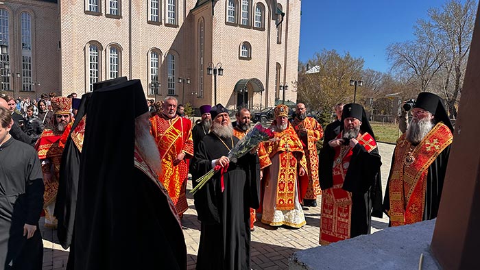 У памятника старцу иерархи и духовенство исполнило пасхальные тропари и величание святому.