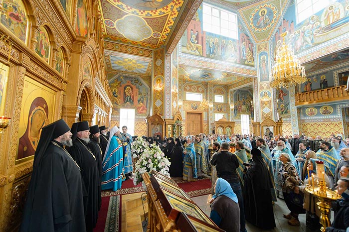 Литургия завершилась славлением Пресвятой Богородице перед Ее Иверским образом и литией у гробницы митрополита Иосифа (Чернова), после чего митрополит Александр поздравил Преосвященных епископов, матушку игумению, духовенство и прихожан с престольным праздником и обратился к верующим со словами архипастырской проповеди.