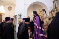 За Богослужением молились насельники Свято-Троицкой обители, сотрудники епархиального управления, прихожане кафедрального собора и паломники с городских храмов и окрестных населенных пунктов. Праздничные песнопения исполнял хор Андреевского собора под управлением В. Федоровой.