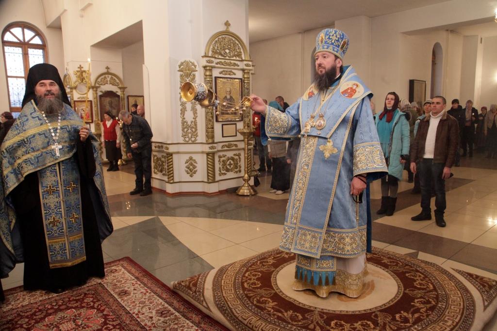 На Всенощном бдении молились насельники Свято-Троицкого мужского монастыря, сотрудники епархиального управления, прихожане кафедрального собора. После прочтения Евангельского зачала, повествующего о сретении святого праведного Симеона Богоприимца с Богомладенцем Иисусом (Лк. 2:25-32), епископ Амфилохий помазал духовенство и молящихся освященным елеем.