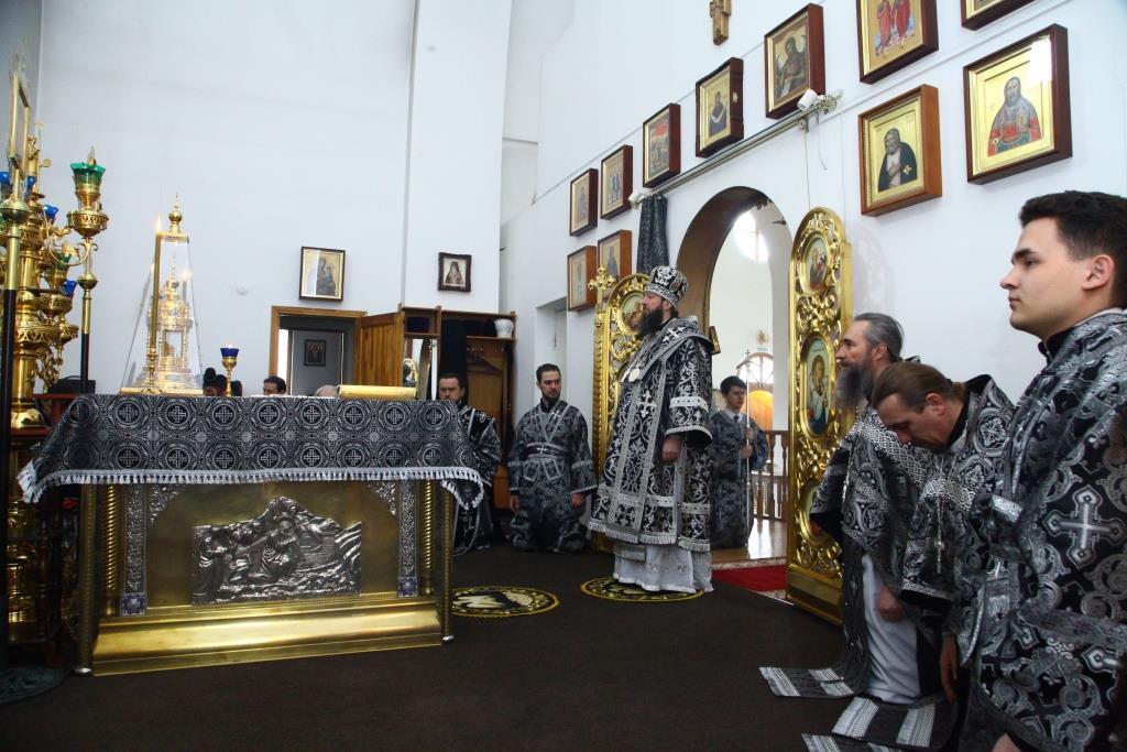 Архипастырю сослужили: духовник епархии архимандрит Спиридон (Теплухин), ключарь кафедрального собора иеромонах Никодим (Авдеев), протоиерей Николай Темирбаев, клирики собора иерей Алексий Клепиков, протодиакон Андрей Дудник, иеродиакон Мефодий (Шевчук), диакон Владимир Лаврешин, секретарь епархии диакон Илия Кван. Песнопения Великой Среды и Литургии Преждеосвященных Даров исполнял хор собора под управлением регента В. Федоровой. За Богослужением молились насельники Свято-Троицкого мужского монастыря и прихожане кафедрального собора.