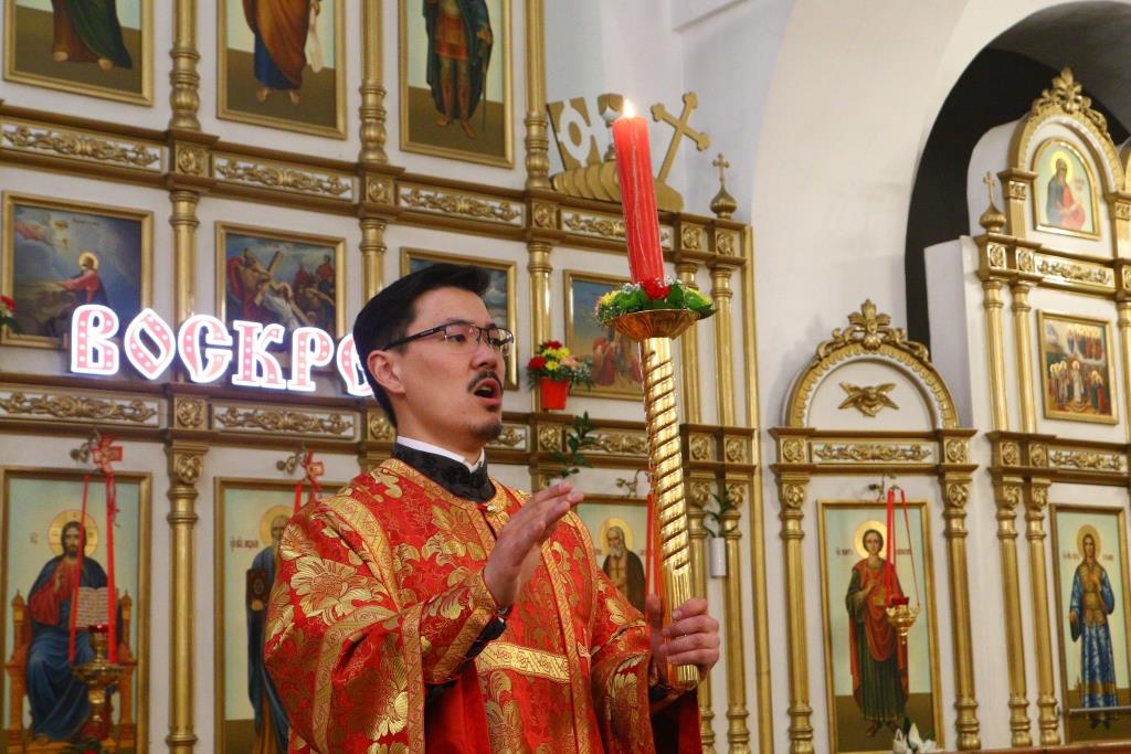 Ровно в полночь, под колокольный звон и пение стихиры «Воскресение Твое, Христе Спасе», был совершен крестный ход. Богослужение продолжилась пением пасхального канона. Пасхальные песнопения исполнял хор кафедрального собора под управлением В. Федоровой. За Богослужением Пасхи молились сотрудники епархиального управления, насельники Свято-Троицкого мужского монастыря, преподаватели и воспитанники Центральной воскресной школы, многочисленные прихожане и паломники главного храма Восточного Казахстана.
