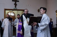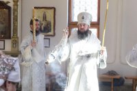 Праздничные песнопения исполнял хор Андреевского собора под управлением регента Н. Романцовой. После прочтения евангельского зачала, повествующего о Вознесении Спасителя, епископ Амфилохий помазал духовенство и прихожан освященным елеем.