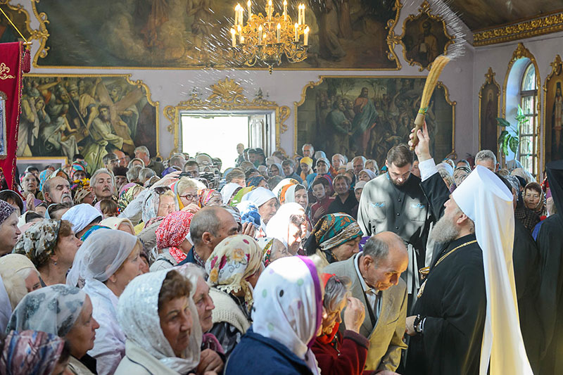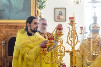 За богослужением великого освящения и Божественной Литургией Предстоятелю Православной Церкви Казахстана сослужили: викарий Астанайской епархии епископ Талдыкорганский Нектарий, епископ Усть-Каменогорский и Семипалатинский Амфилохий; настоятель храма в честь иконы Пресвятой Богородицы «Всех скорбящих радость» протоиерей Евгений Воробьев, благочинный Талдыкорганского церковного округа иеромонах Клавдиан (Поляков), ключарь Петропавловского храма Алма-Аты протоиерей Кирилл Шкляр, ключарь храма Веры, Надежды, Любови и Софии – Представительства Митрополичьего округа в Москве – иерей Сергий Неретин, помощник Главы Митрополичьего округа иерей Георгий Сидоров, духовенство Талдыкорганского благочиния, диаконский чин возглавил клирик Вознесенского кафедрального собора города Алма-Аты протодиакон Николай Гринкевич.