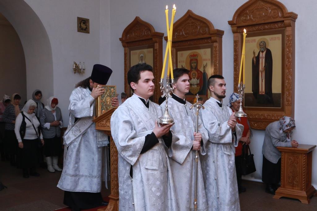 Песнопения Божественной Литургии исполнял хор кафедрального соборного храма под управлением регента В. Федоровой. За воскресным богослужением молились насельники Свято-Троицкого мужского монастыря и прихожане монастырского храма. Перед причастием мирян проповедовал иерей Константин Дьяков.