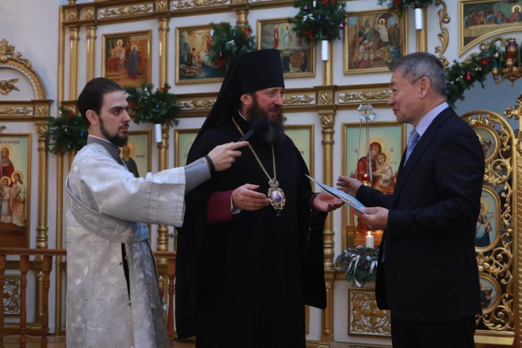 Высоких гостей встречал епископ Амфилохий, духовенство и многочисленные прихожане кафедрального собора. Управляющий Усть-Каменогорской епархией поблагодарил гостей за визит, отметив, что благодаря Всевышнему Творцу и разумной политике Главы нашего государства, а также взаимоуважению и взаимопониманию в Казахстане царят спокойствие и согласие. Единство, сплоченность и твердость духа казахстанцев способствовали активному развитию гражданского и межконфессионального согласия. Епископ Амфилохий поздравил Даниала Кенжетаевича с праздником Рождества Христова, пожелав руководителю области крепкого здоровья и плодотворного труда на благо Восточно-Казахстанской области и всего казахстанского общества. В ответном слове Д.К. Ахметов поздравил Архипастыря и всех православных христиан с великим праздником Рождества Христова. Глава области отметил, что суверенный Казахстан за годы независимости стал образцом мирного сосуществования представителей различных этносов, религиозных конфессий и культур. Государственная власть, духовные лидеры, общественность Казахстана сообща трудятся над созданием сильного, динамичного, современного государства. Большое место в этом процессе занимает Православие. Православная Церковь помогает людям обрести веру и покой, укрепляя их на жизненном пути; она играет заметную роль в упрочении института семьи, материнства и детства, гармонизации межнациональных и межрелигиозных отношений, внося огромный вклад в развитие духовного единства, укрепления дружбы и межконфессионального согласия в стране. Даниал Кенжетаевич призвал прихожан и паломников с любовью относиться к духовным традициям многонационального Казахстана, указав, что взаимное уважение и братская поддержка являются гарантом мирного развития нашего Отечества.