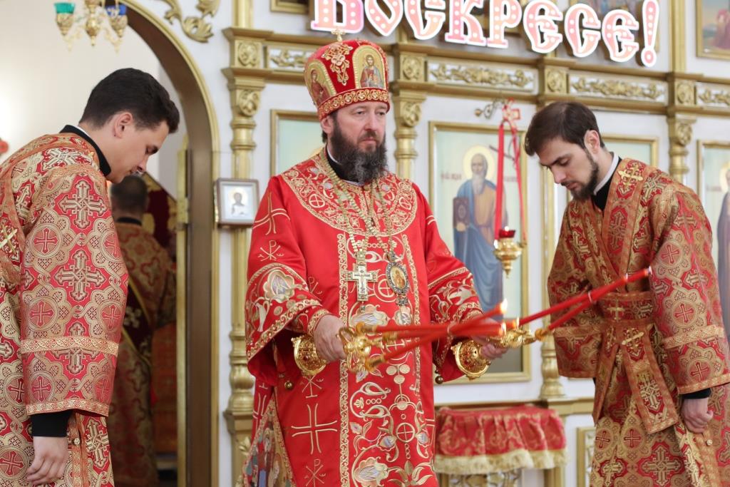 После заамвонной молитвы было совершено славление – всенародное пение пасхальных стихир. В завершение Богослужения Преосвященнейший Владыка поздравил духовенство и мирян с праздником Пасхи Господней и обратился к молящимся со словами проповеди.