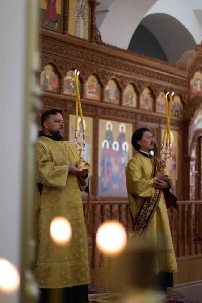 Хор под управлением регента Н. Романцовой исполнял песнопения Божественной Литургии. За богослужением молились прихожане кафедрального собора и братия Свято-Троицкого мужского монастыря города Усть-Каменогорска. Перед причастием мирян проповедовал иеромонах Силуан (Магилев).