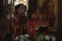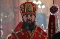 После заамвонной молитвы Владыка епископ с клириками и молящимися совершил пропел стихиры Пасхи. В завершение праздничного богослужения Преосвященнейший епископ Амфилохий поздравил духовенство и молящихся с праздником Пасхи Господней и обратился народу Божию со словами проповеди.
