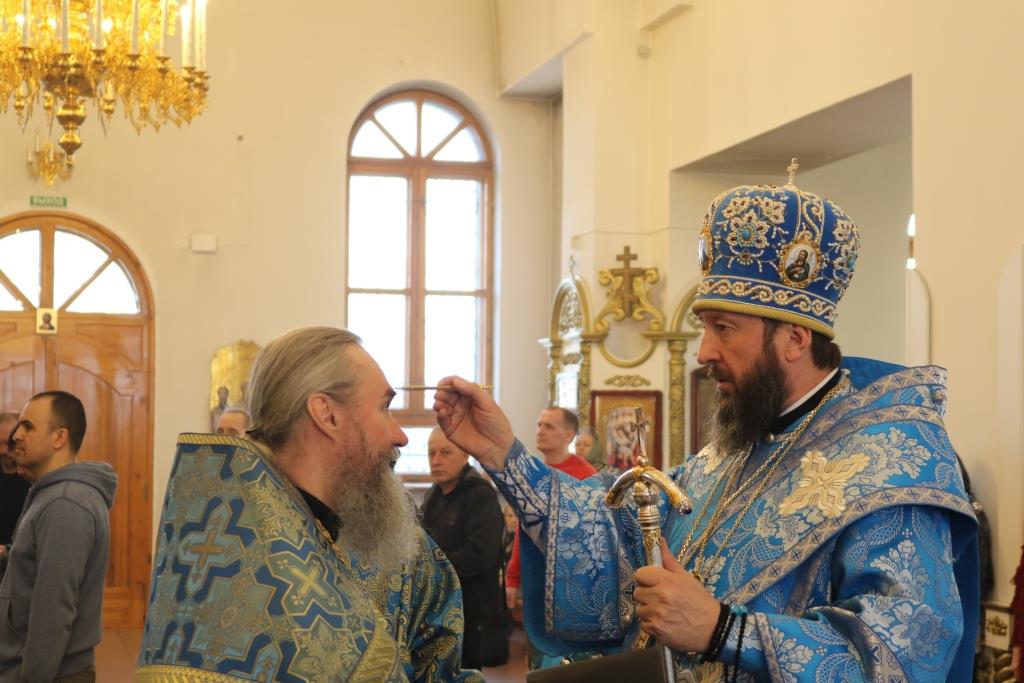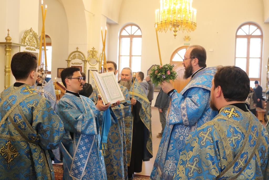 Его Преосвященству сослужили: ключарь собора иеромонах Никодим (Авдеев), клирики собора иерей Алексий Клепиков, иеромонах Силуан (Магилев), иерей Роман Подрезов, иерей Константин Дьяков, секретарь епархии диакон Илия Кван, протодиакон Андрей Дудник. Песнопения праздника Благовещения исполнял хор под управлением регента Н. Романцовой. За вечерним богослужением совершалась лития – сугубо моление с освящением пшеницы, хлеба, вина и елея.