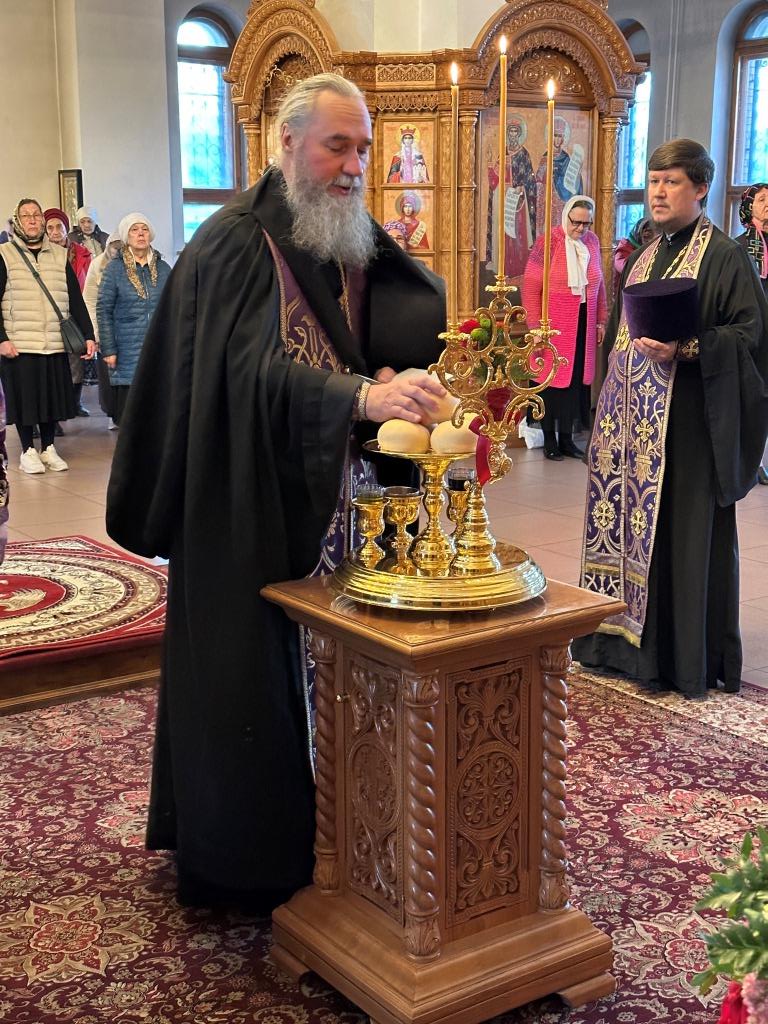Владыке архиепископу сослужили ключарь собора иеромонах Никодим (Авдеев), клирики собора иерей Виталий Адаменков, иерей Роман Подрезов, иерей Константин Дьяков, протодиакон Андрей Дудник, секретарь епархии диакон Илия Кван.