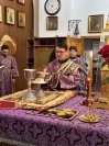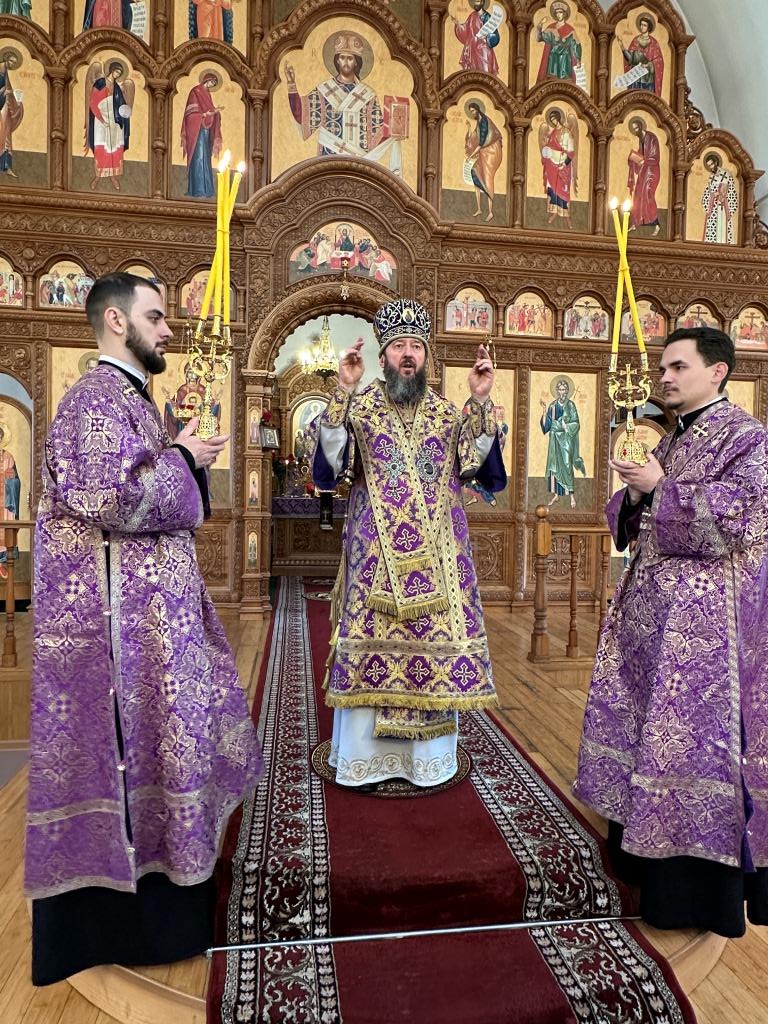 Его Высокопреосвященству сослужили: ключарь кафедрального собора иеромонах Никодим (Авдеев), клирики собора иерей Роман Подрезов и иерей Константин Дьяков, протодиакон Андрей Дудник, секретарь епархии диакон Илия Кван.