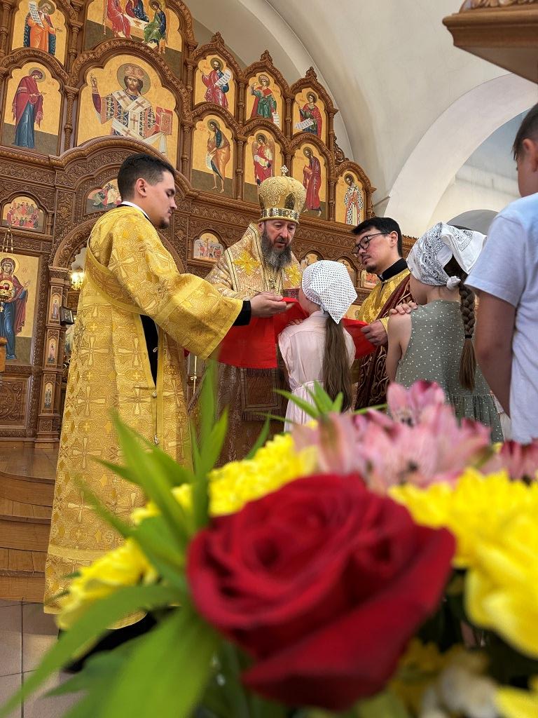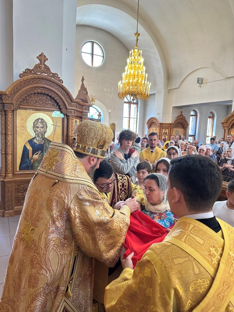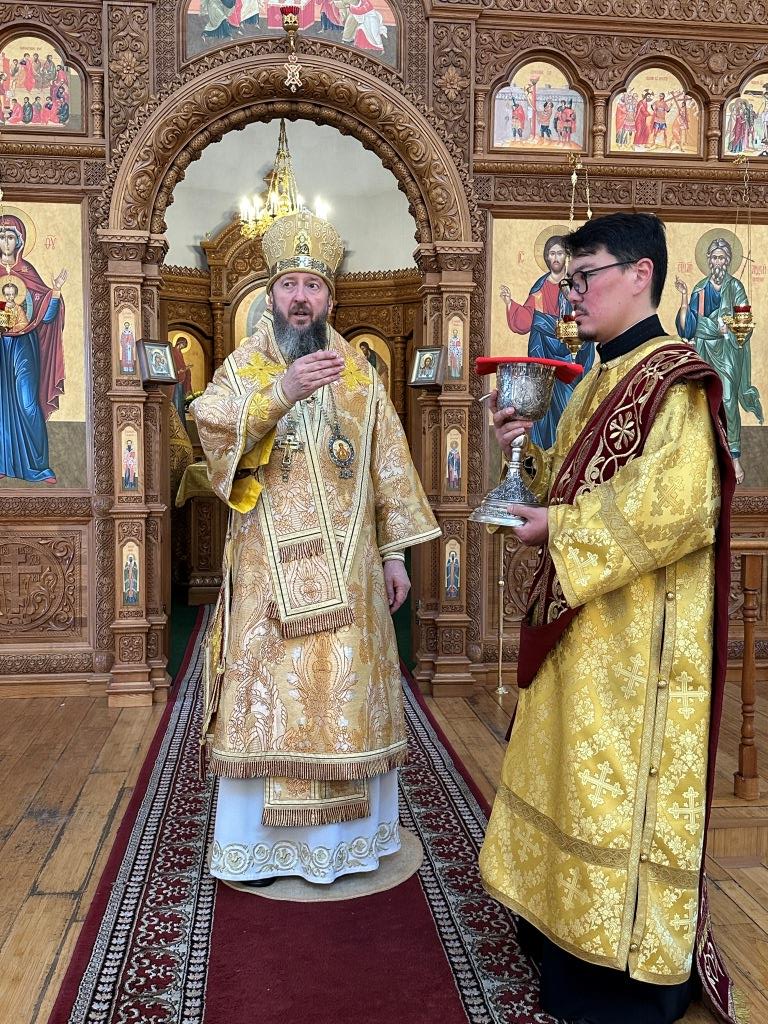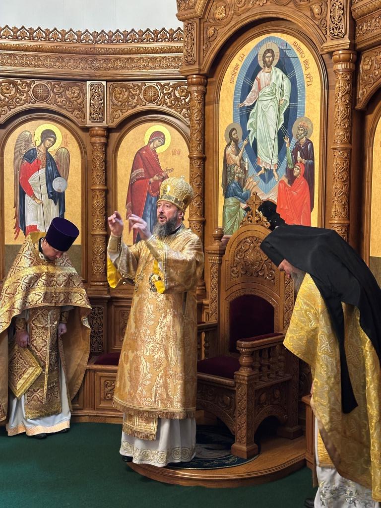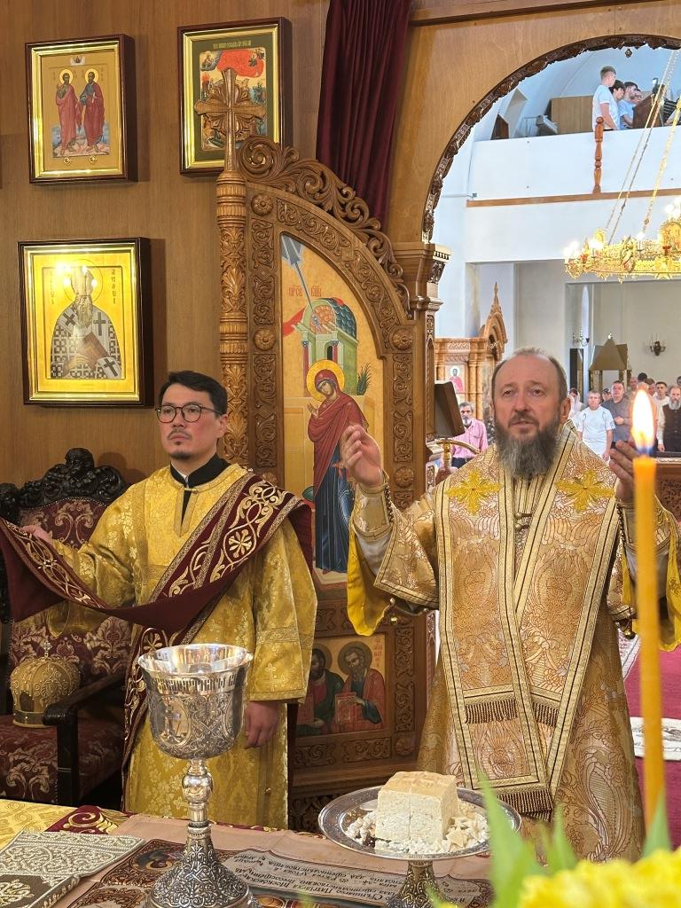 За воскресным богослужением молились насельники Свято-Троицкого мужского монастыря города Усть-Каменогорска, сотрудники епархиального управления, прихожане главного храма епархии, преподаватели и воспитанники приходской воскресной школы. Песнопения Божественной Литургии исполнял хор Андреевского кафедрального собора, регент Н. Романцова. Перед причастием мирян проповедовал священник Роман Подрезов.