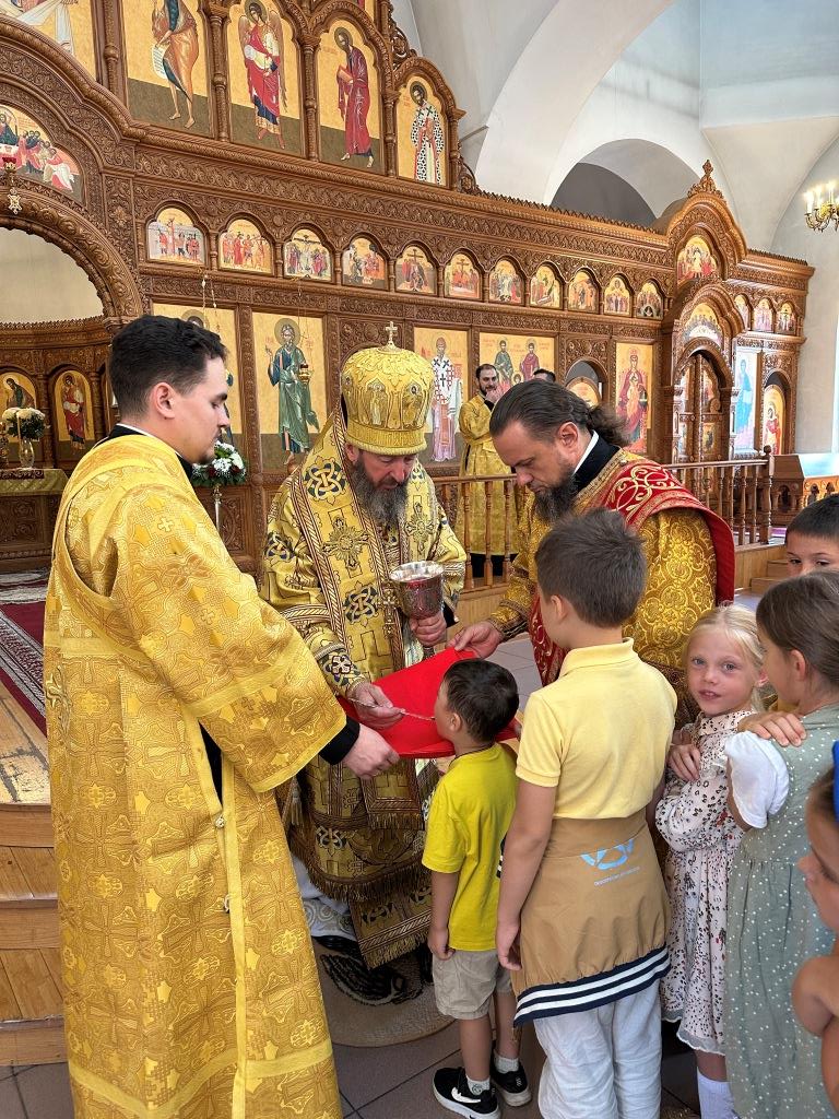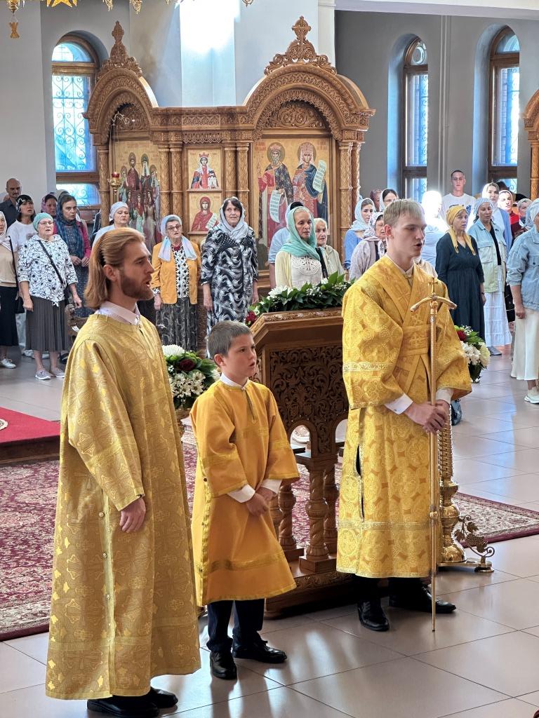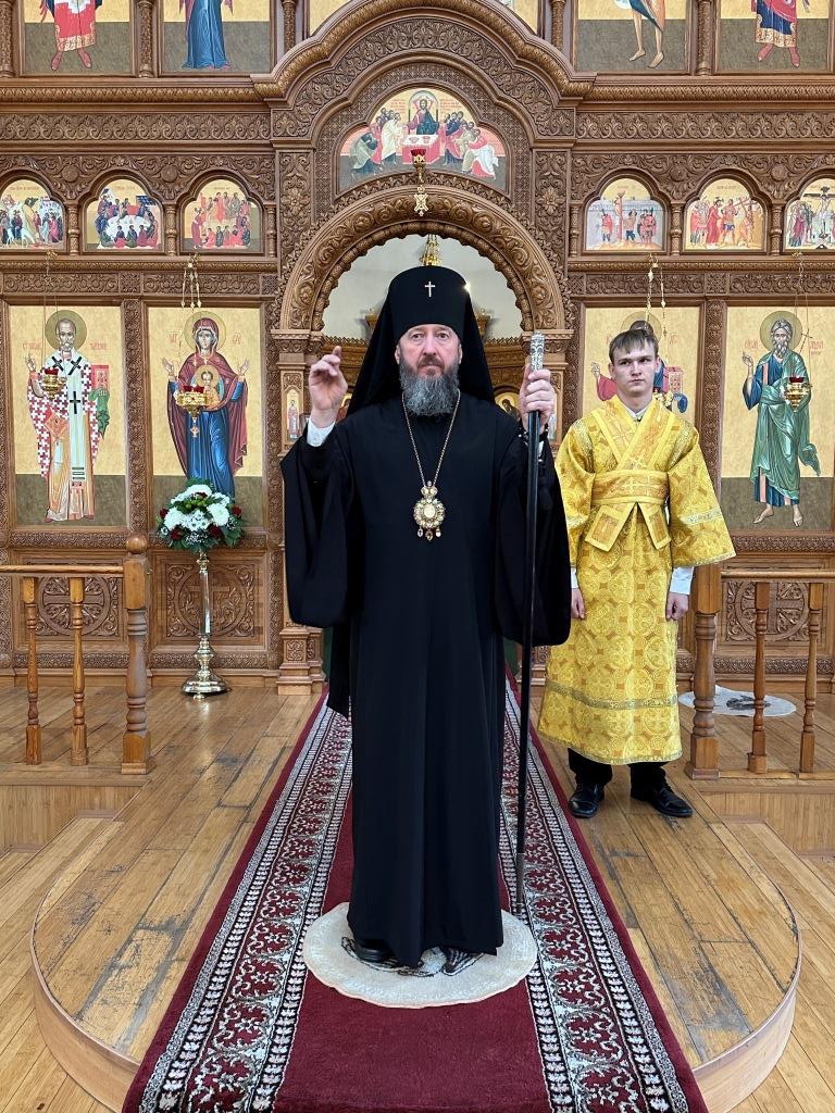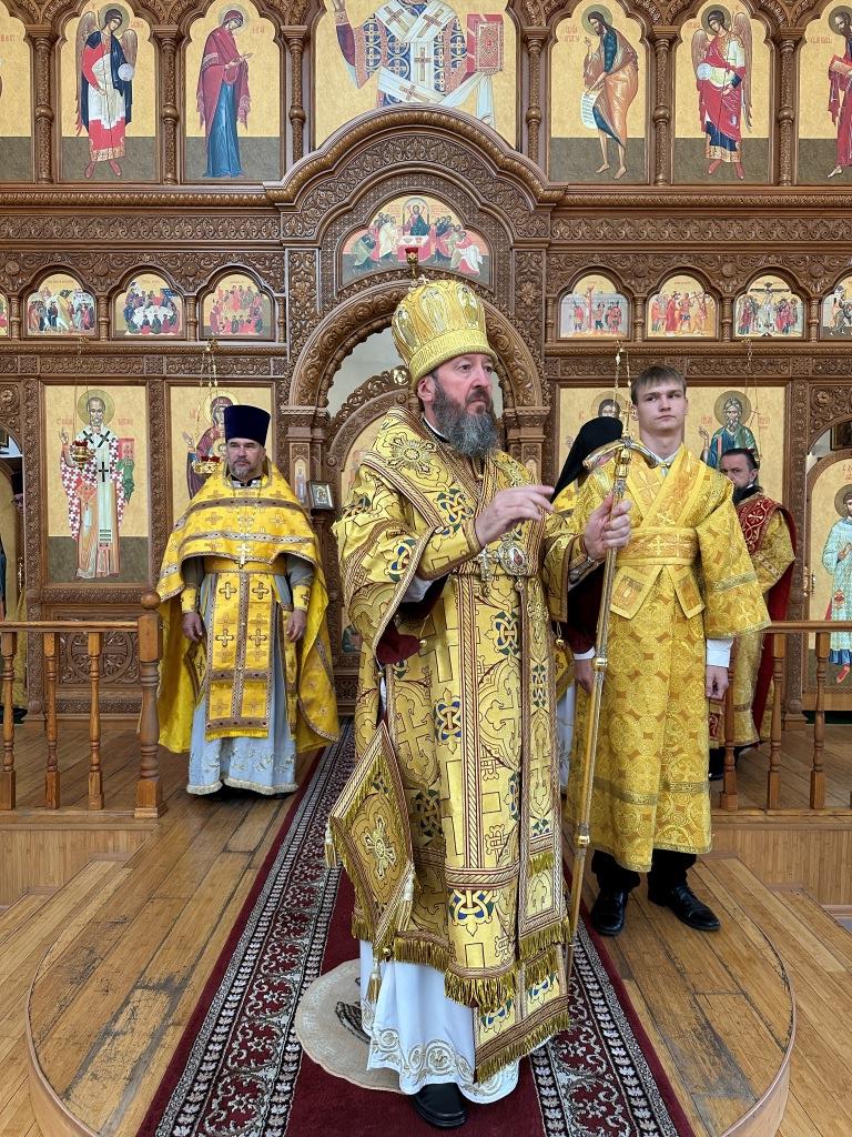 Его Высокопреосвященству сослужили: ключарь Андреевского собора иеромонах Никодим (Авдеев), клирик собора иерей Виталий Адаменков, протодиакон Андрей Дудник, секретарь епархии диакон Илия Кван. Хор род управлением регента Н. Романцовой исполнял богослужебные песнопения. Проповедь на запричастном стихе произнес иерей Виталий Адаменков.