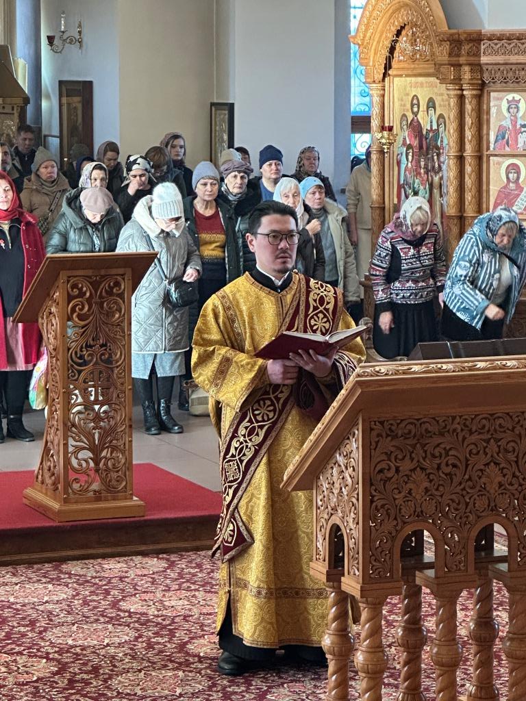 За Богослужением молились насельники Свято-Троицкого мужского монастыря города Усть-Каменогорска, сотрудники епархиального управления, преподаватели и воспитанники Центральной воскресной школы, прихожане кафедрального собора. Песнопения воскресного дня и Божественной Литургии исполнял хор кафедрального собора под управлением регента Н. Романцовой.