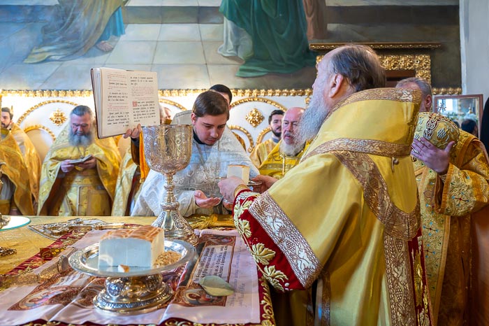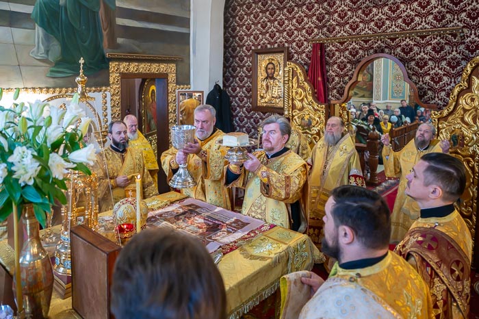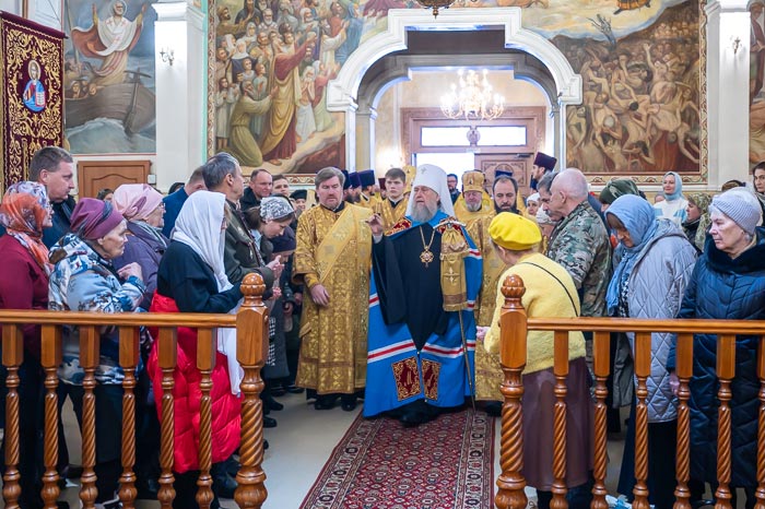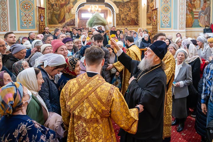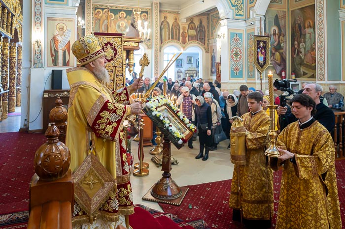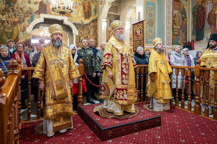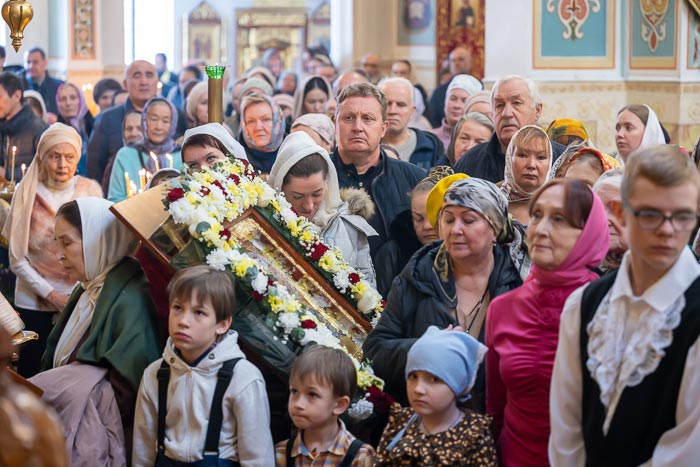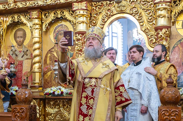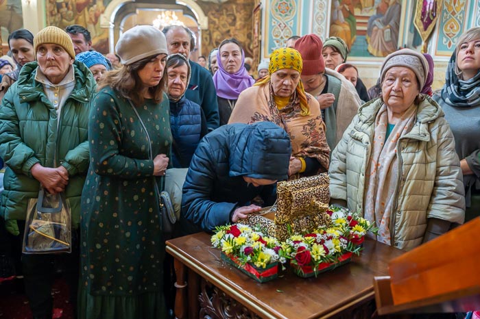 Перед началом Литургии для молитвенного поклонения и духовного укрепления верующих из алтаря собора был изнесен ковчег с мощами святителя и чудотворца Николая.