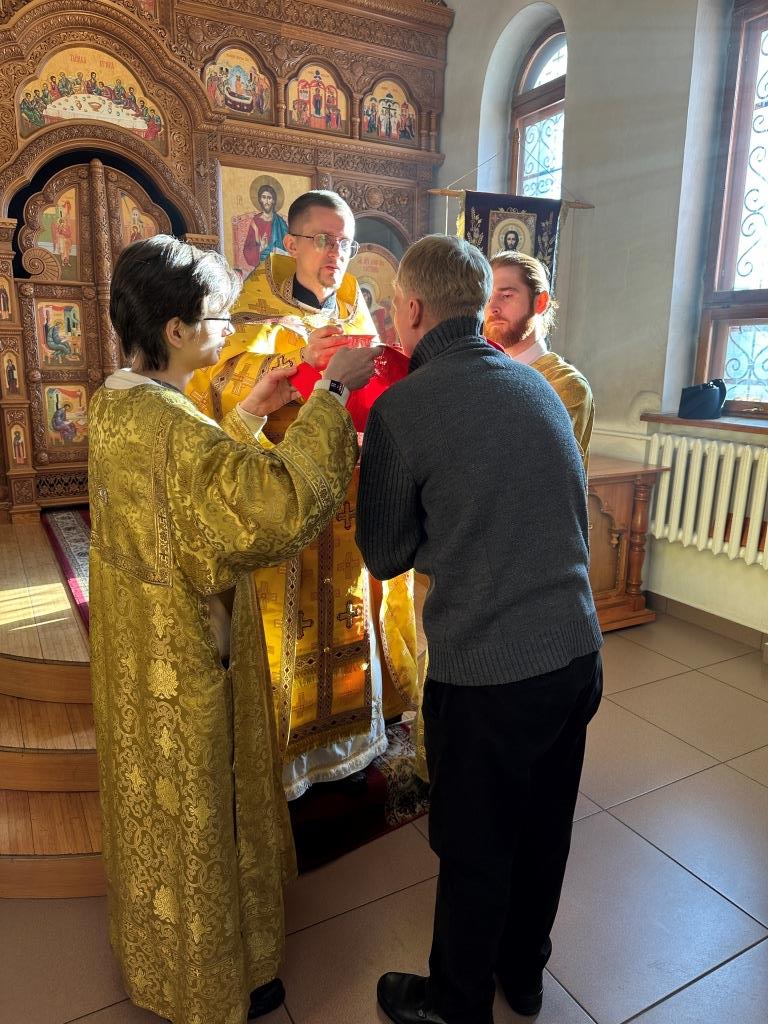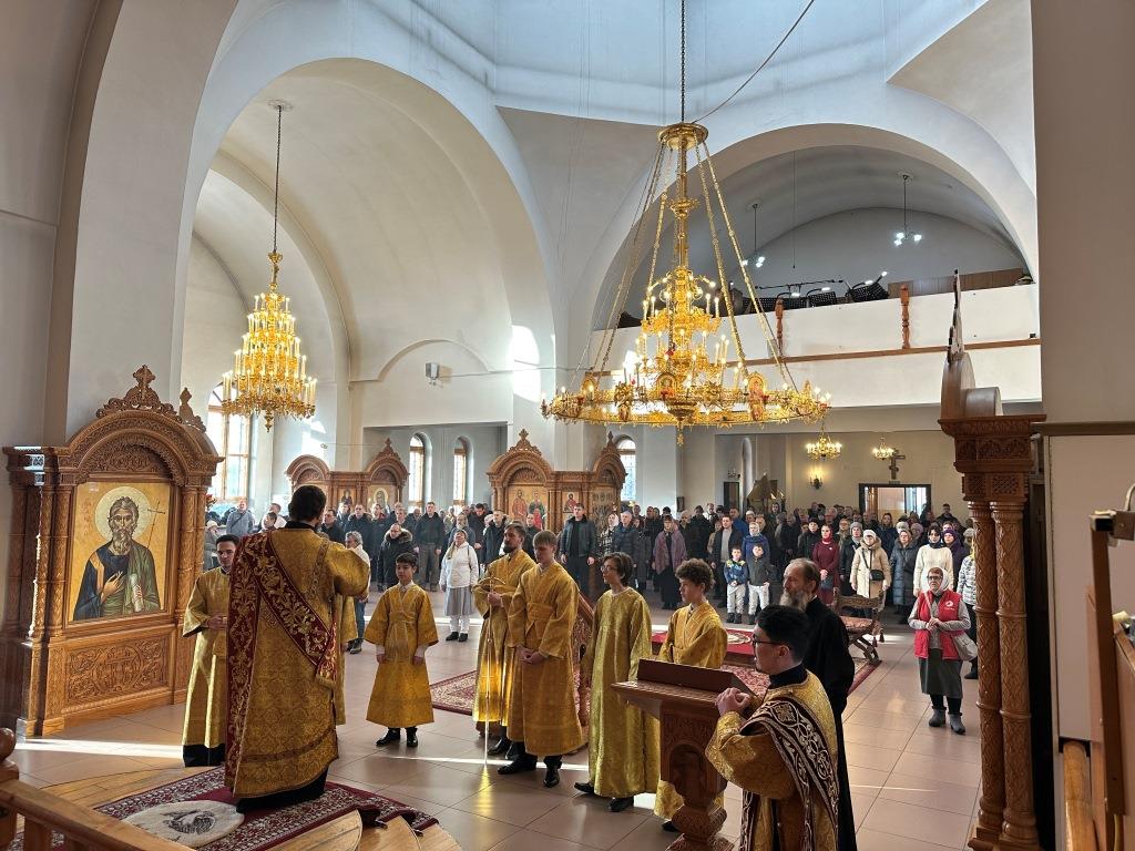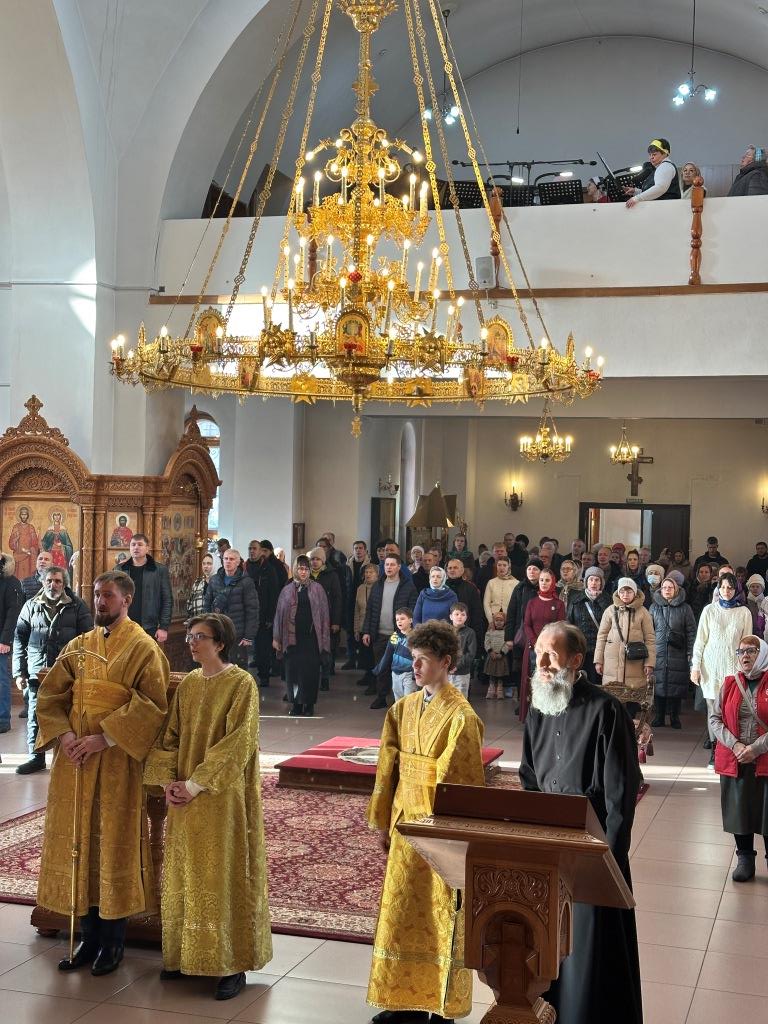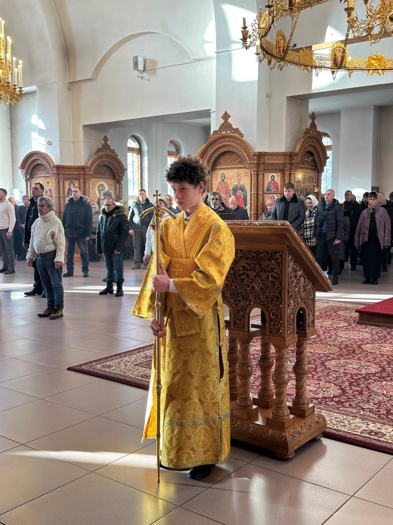 Хор под управлением регента Н. Романцовой исполнял песнопения Божественной Литургии и Недели святых праотец. За воскресным богослужением молились прихожане собора, преподаватели и воспитанники Центральной воскресной школы, сотрудники епархиального управления, насельники Свято-Троицкого мужского монастыря города Усть-Каменогорска. Перед причастием мирян проповедовал священник Константин Дьяков.