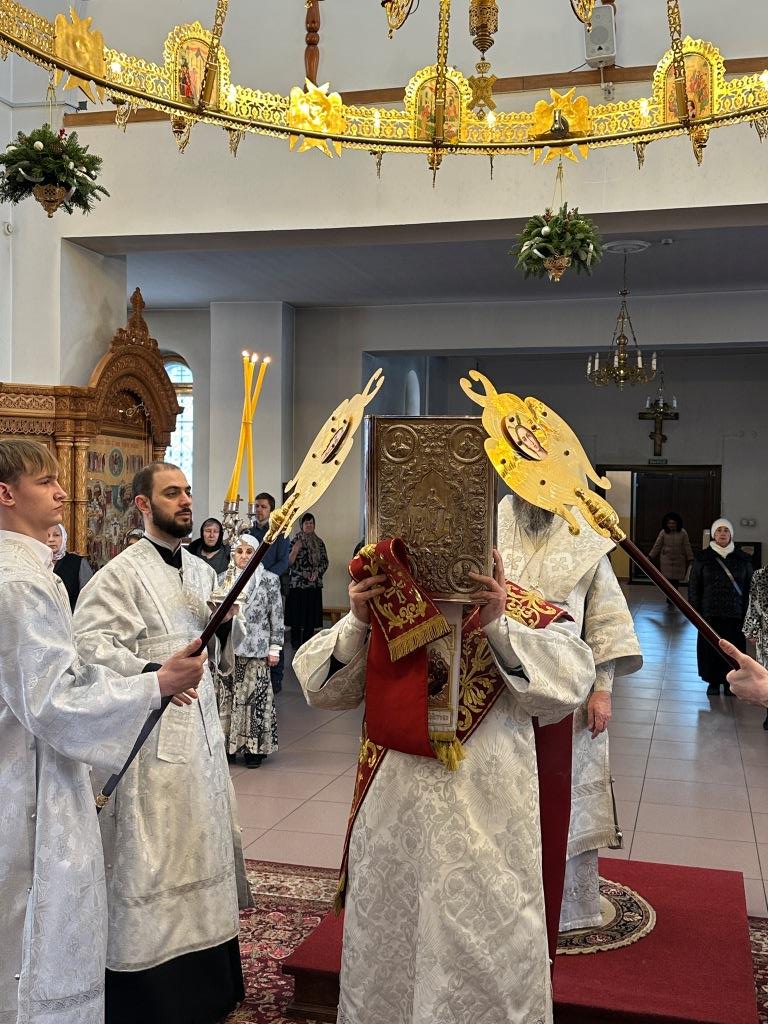 В завершение богослужения Рождественского ссочельника Высокопреосвященнейший Архипастырь с клириками воспел тропарь и кондак Рождеству Христову у праздничной иконы, украшенной горящим светильником – символом Богомладенца Иисуса Христа, после чего Владыка архиепископ поздравил всех молящихся с великим праздником Рождества Христова: