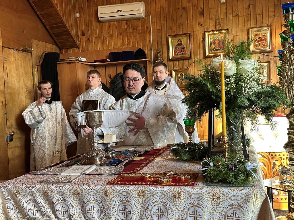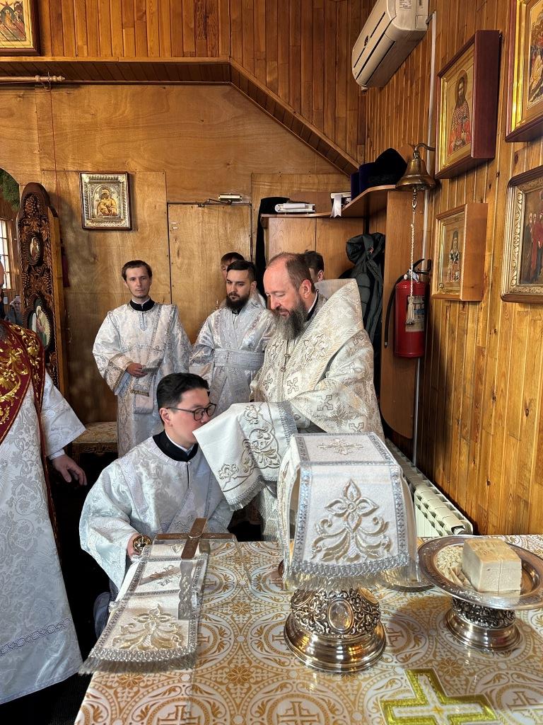 Его Высокопреосвященству сослужили: благочинный Усть-Каменогорского церковного округа и настоятель Покровского собора иеромонах Силуан (Магилев), ключарь Покровского собора иерей Иоанн Толмачев, секретарь епархии диакон Илия Кван, протодиакон Андрей Дудник, протодиакон Александр Якушев, диакон Кирилл Нарушин.