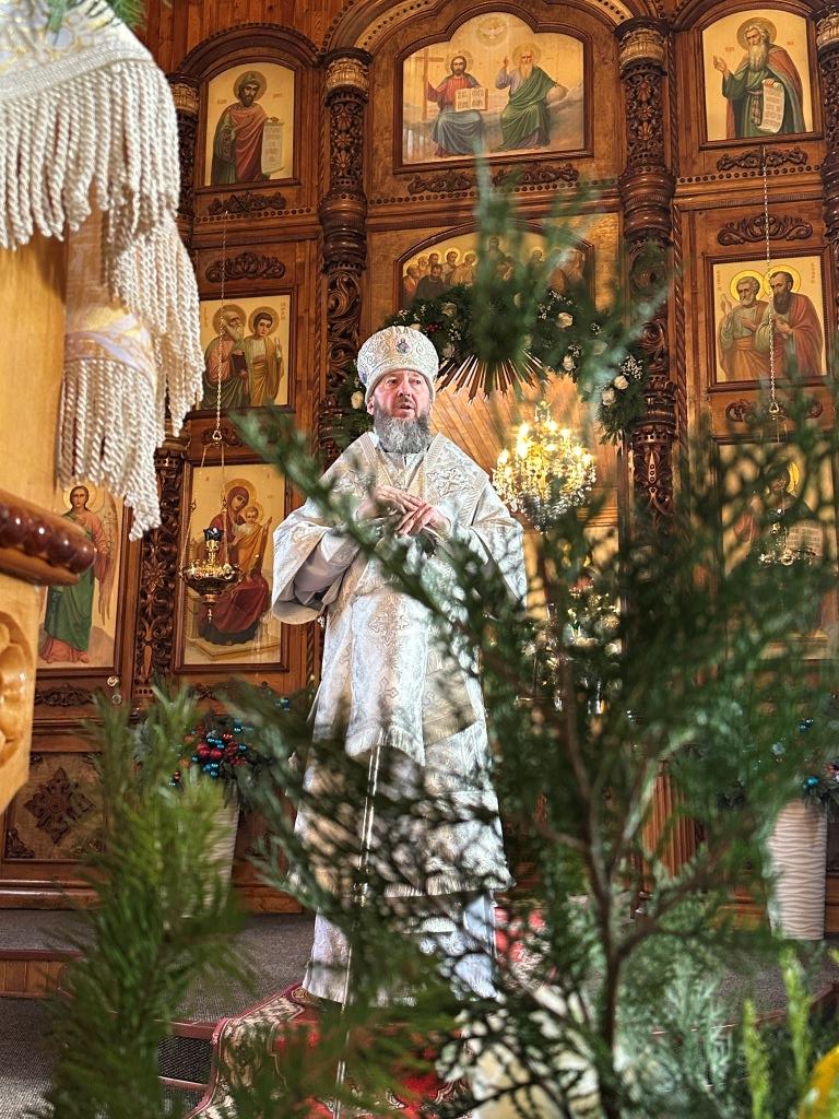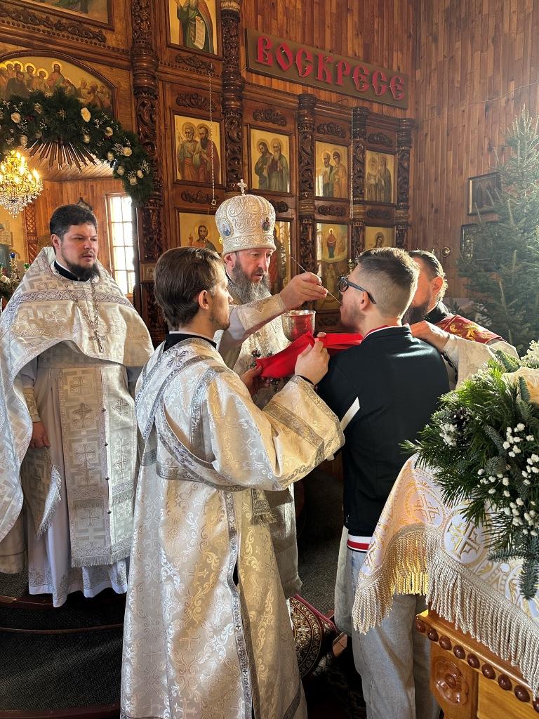 После заамвонной молитвы архиепископ Амфилохий с духовенством и прихожанами воспел славление Богомладенцу Христу и Его Пречистой Матери, затем Высокопреосвященнейший Владыка поздравил собравшихся с великим праздником Рождества и произнёс архипастырское наставление.