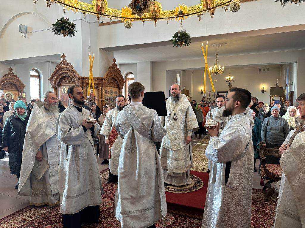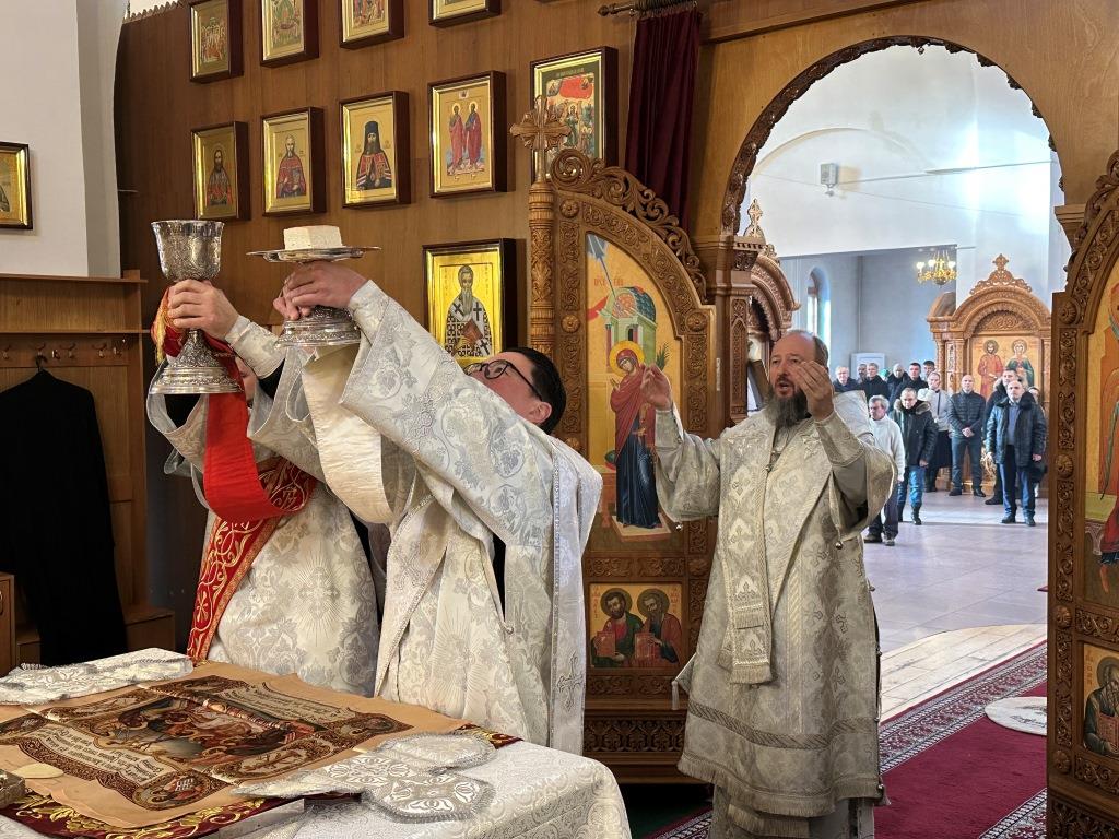Хор кафедрального собора исполнял песнопения Божественной Литургии, регент Н. Романцова. За воскресным богослужением молились сотрудники епархиального управления, насельники Свято-Троицкого мужского монастыря города Усть-Каменогорска, прихожане собора, преподаватели и воспитанники Центральной воскресной школы. Перед причастием мирян проповедовал священник Роман Подрезов.