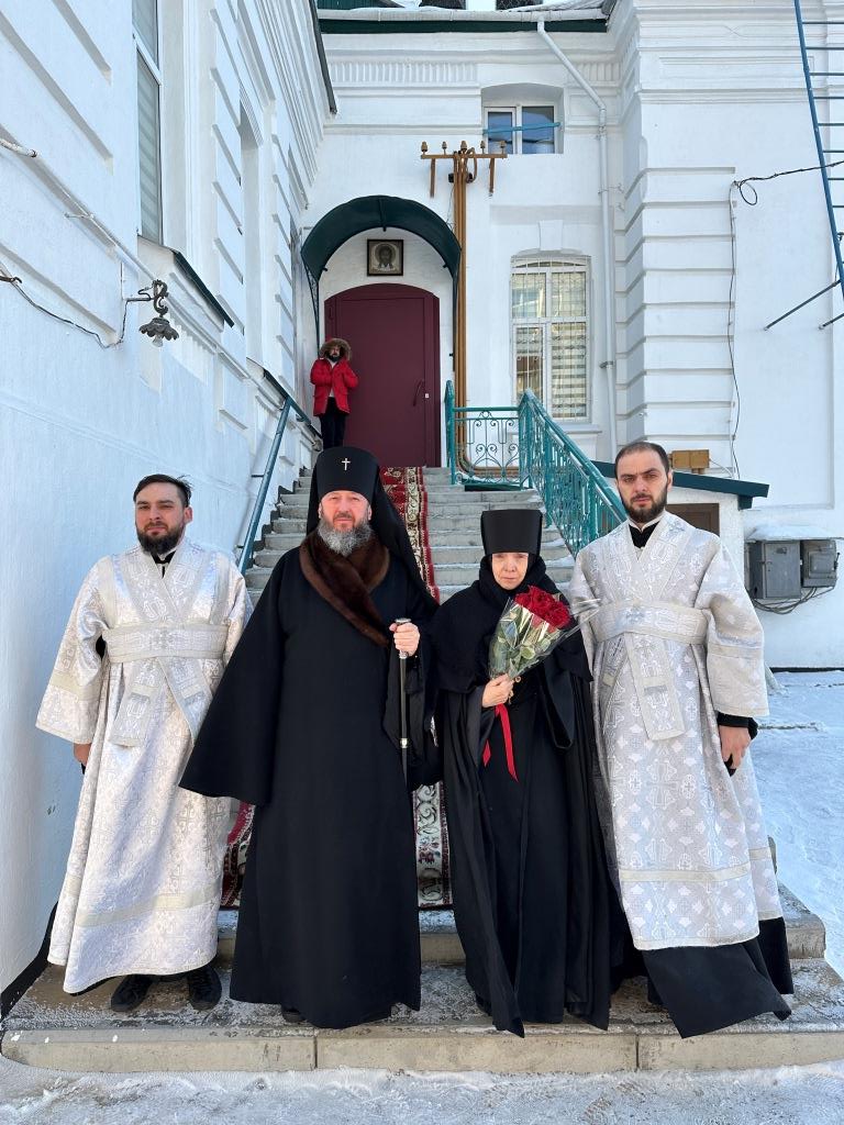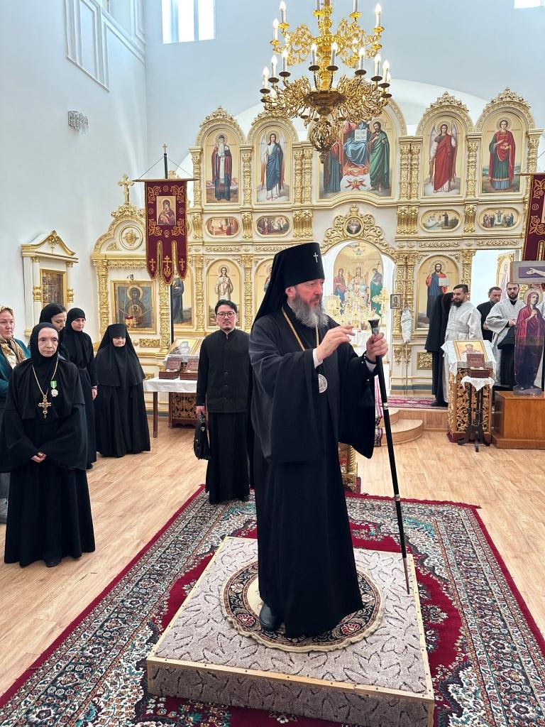 После завершения богослужения Владыка архиепископ поздравил матушку-игумению и всех молящихся с грядущим двунадесятым торжеством Крещения Господня и произнес слова святительского поучения.