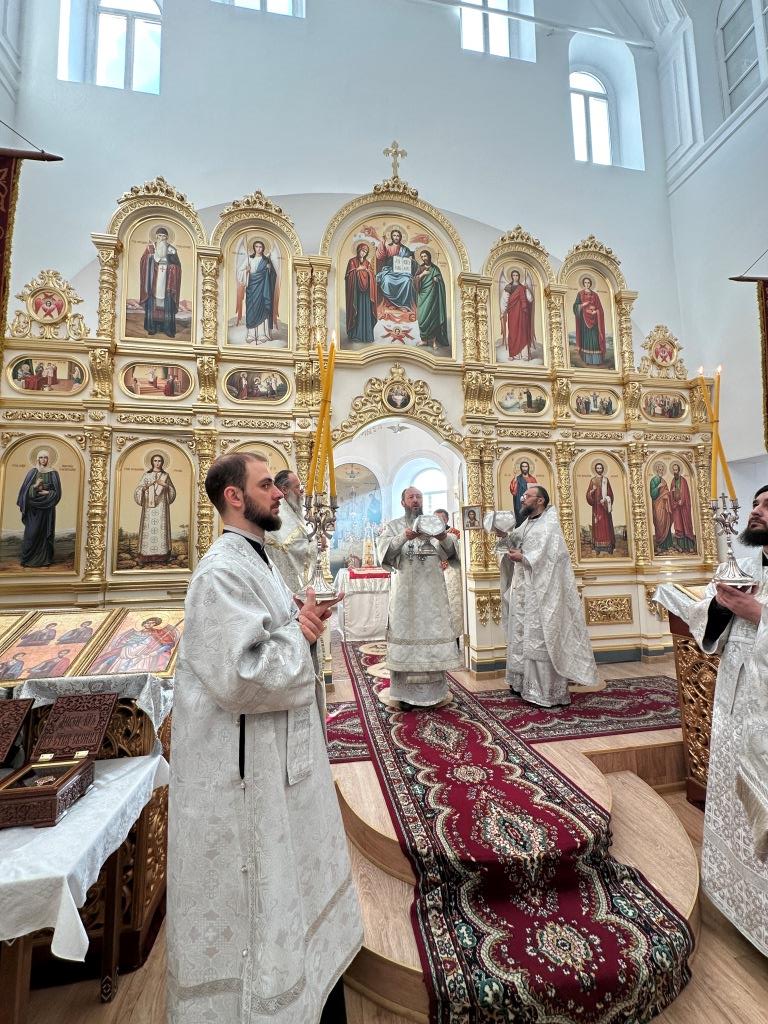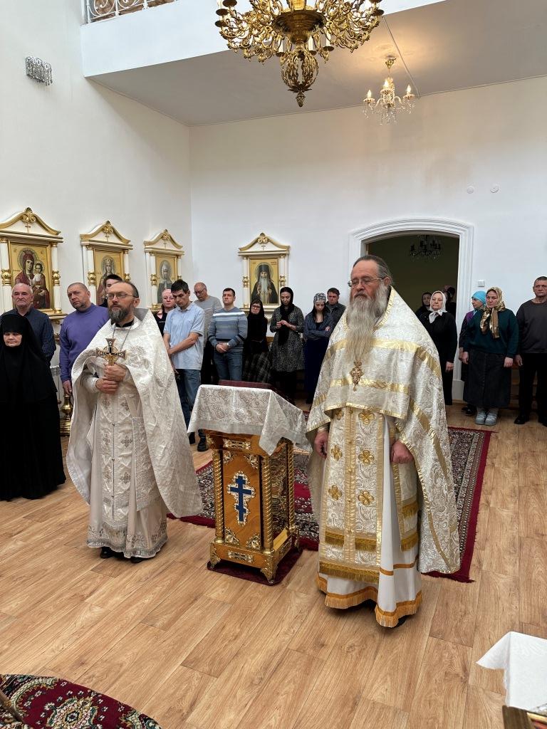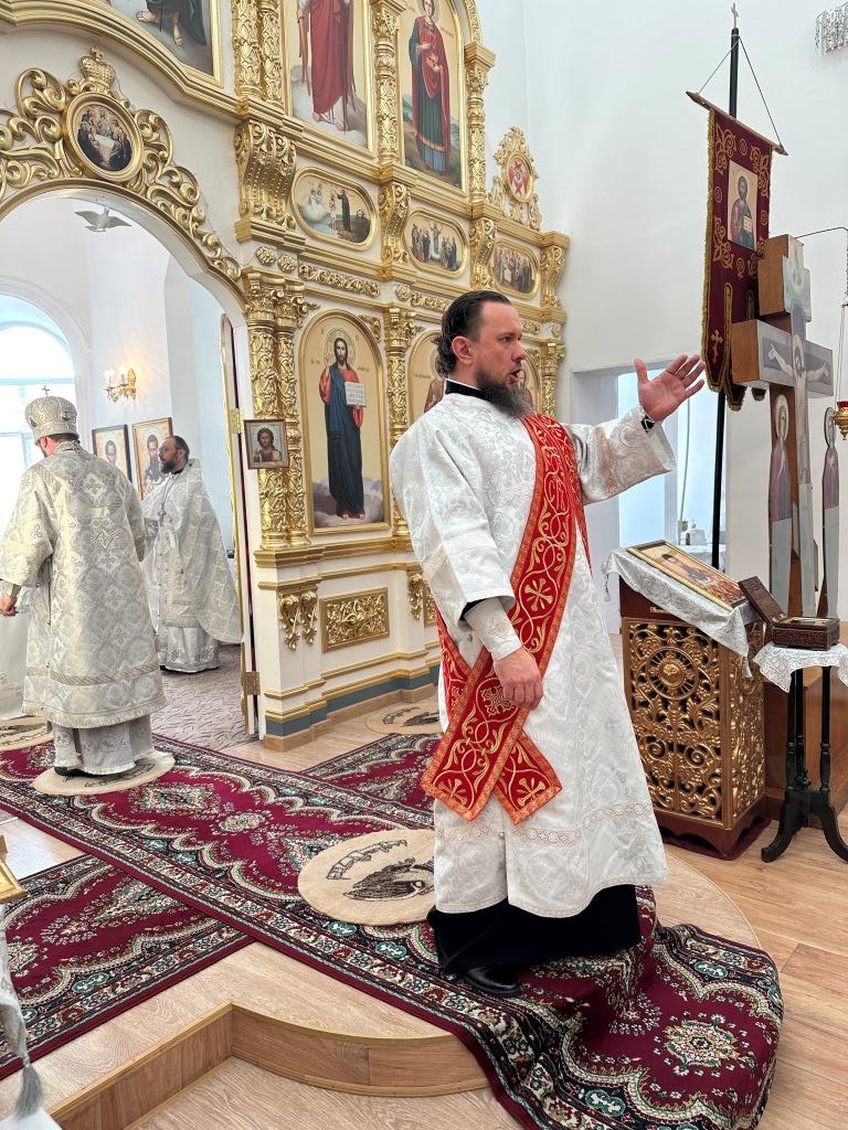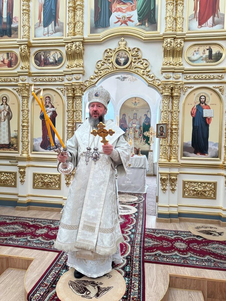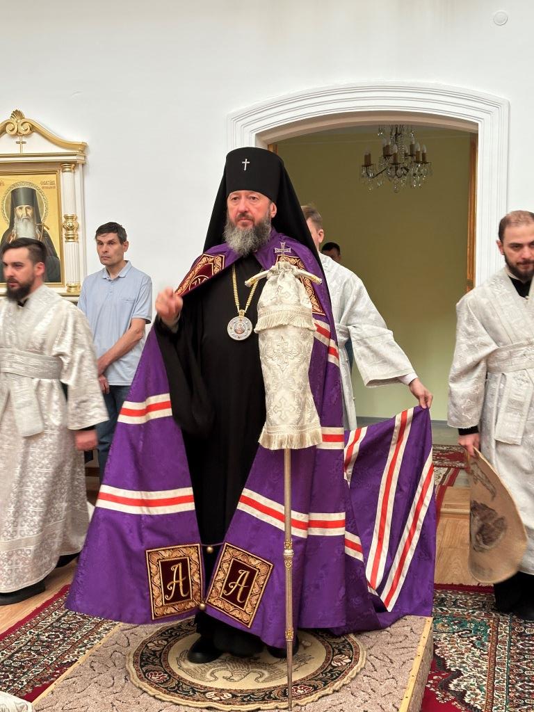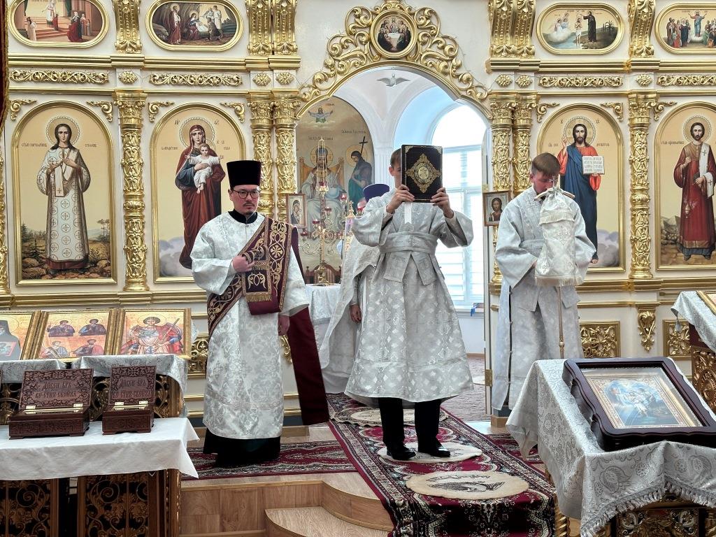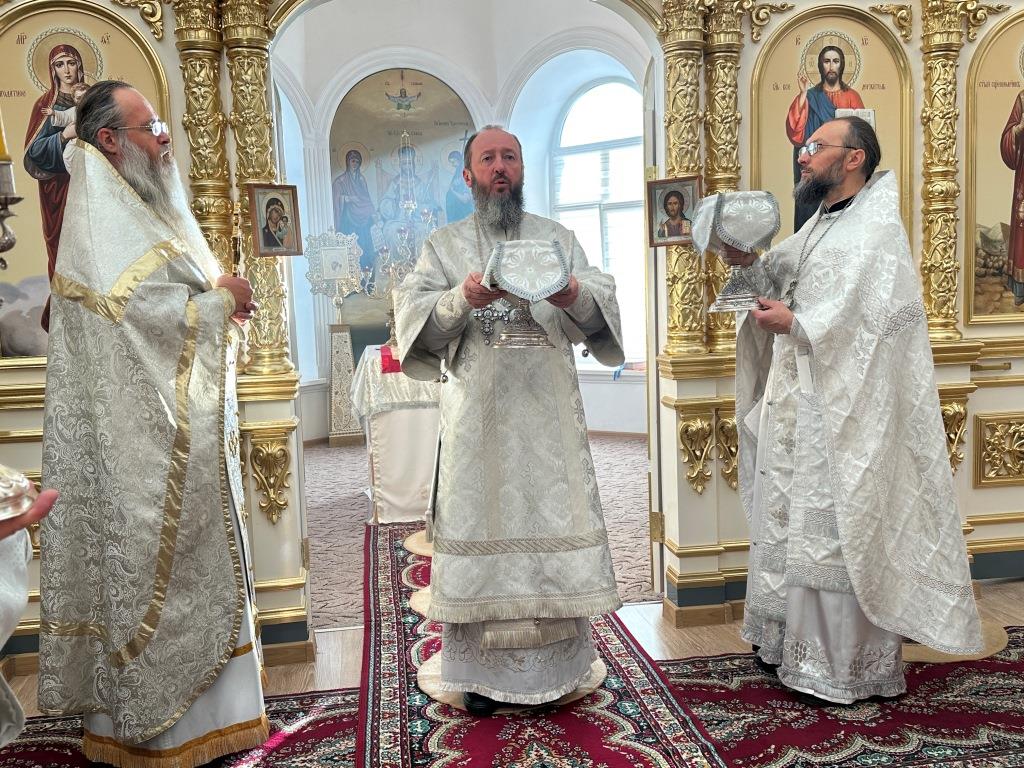 Его Высокопреосвященству сослужили: благочинный Семипалатинского церковного округа протоиерей Роман Сычук, клирик Знаменско-Абалацкой обители иеромонах Агапит (Никонов); протодиакон Андрей Дудник, секретарь епархии диакон Илия Кван.