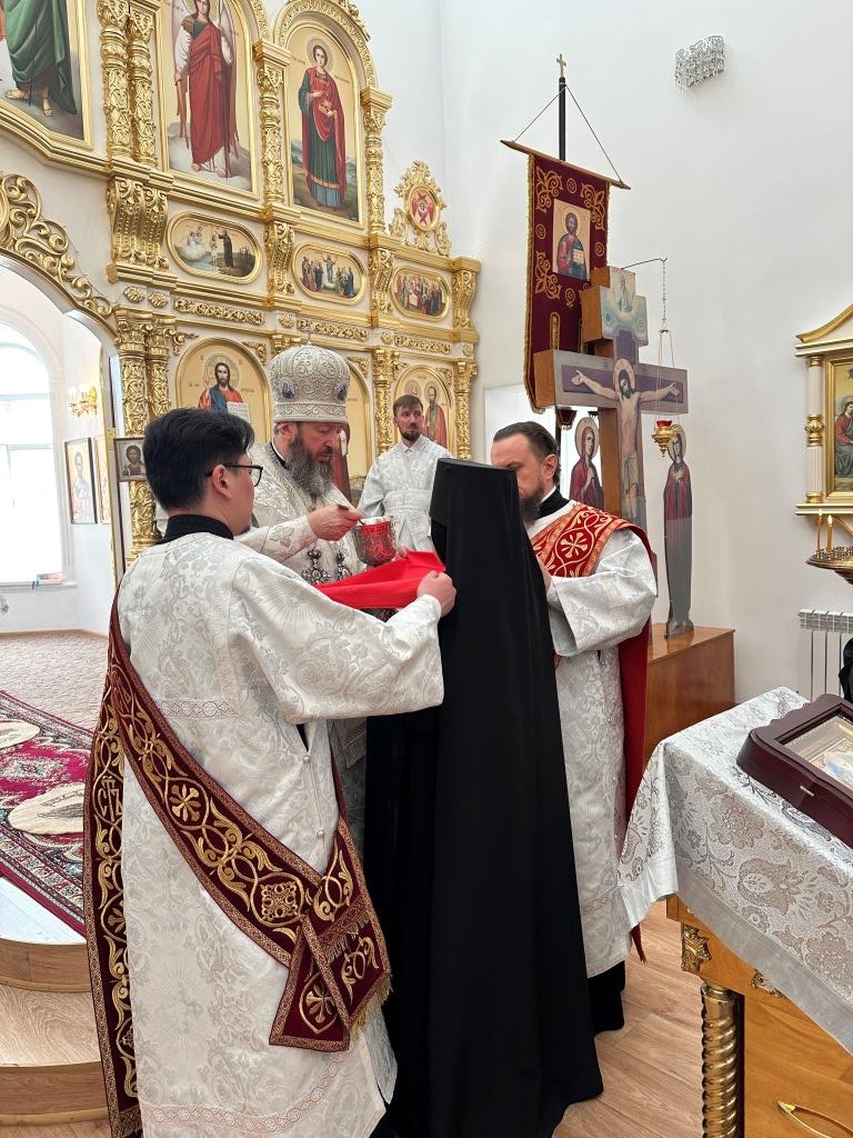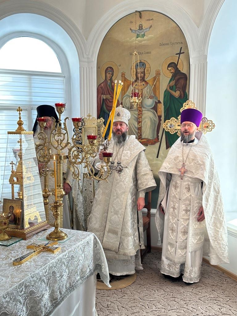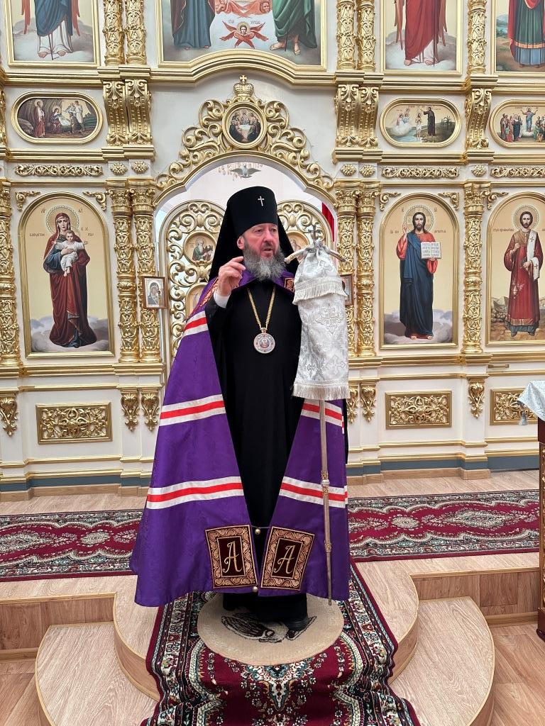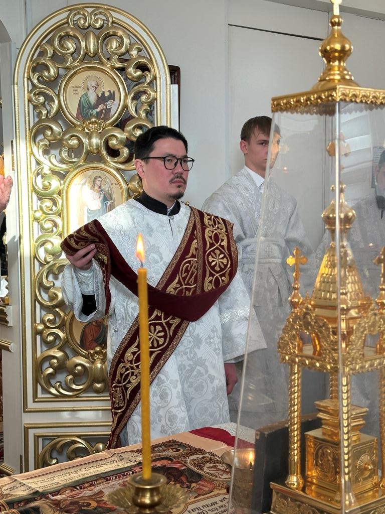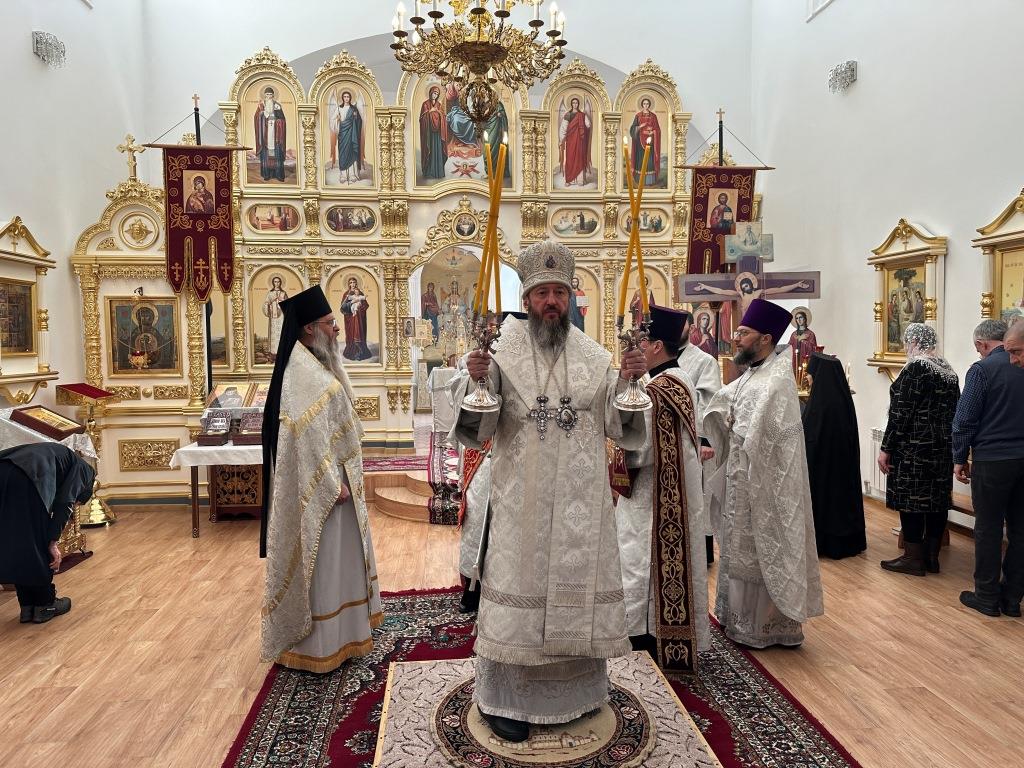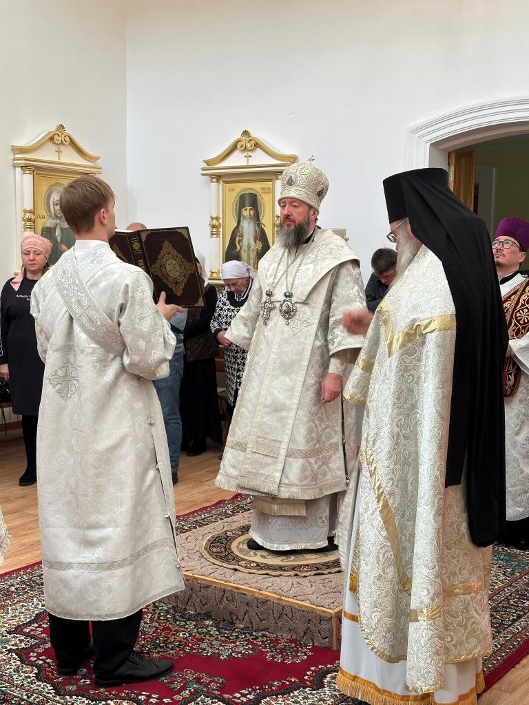 Его Высокопреосвященству сослужили: благочинный Семипалатинского церковного округа протоиерей Роман Сычук, клирик Знаменско-Абалацкой обители иеромонах Агапит (Никонов); протодиакон Андрей Дудник, секретарь епархии диакон Илия Кван.