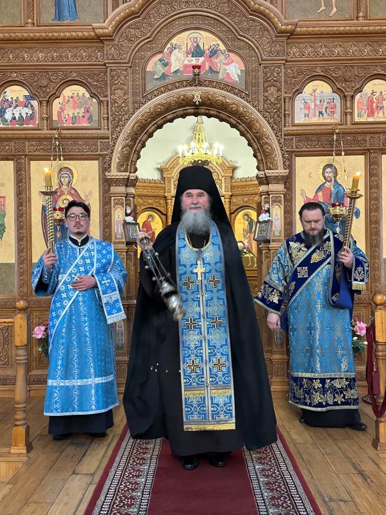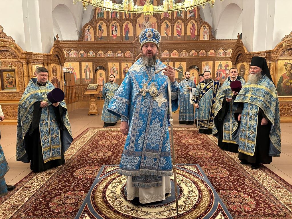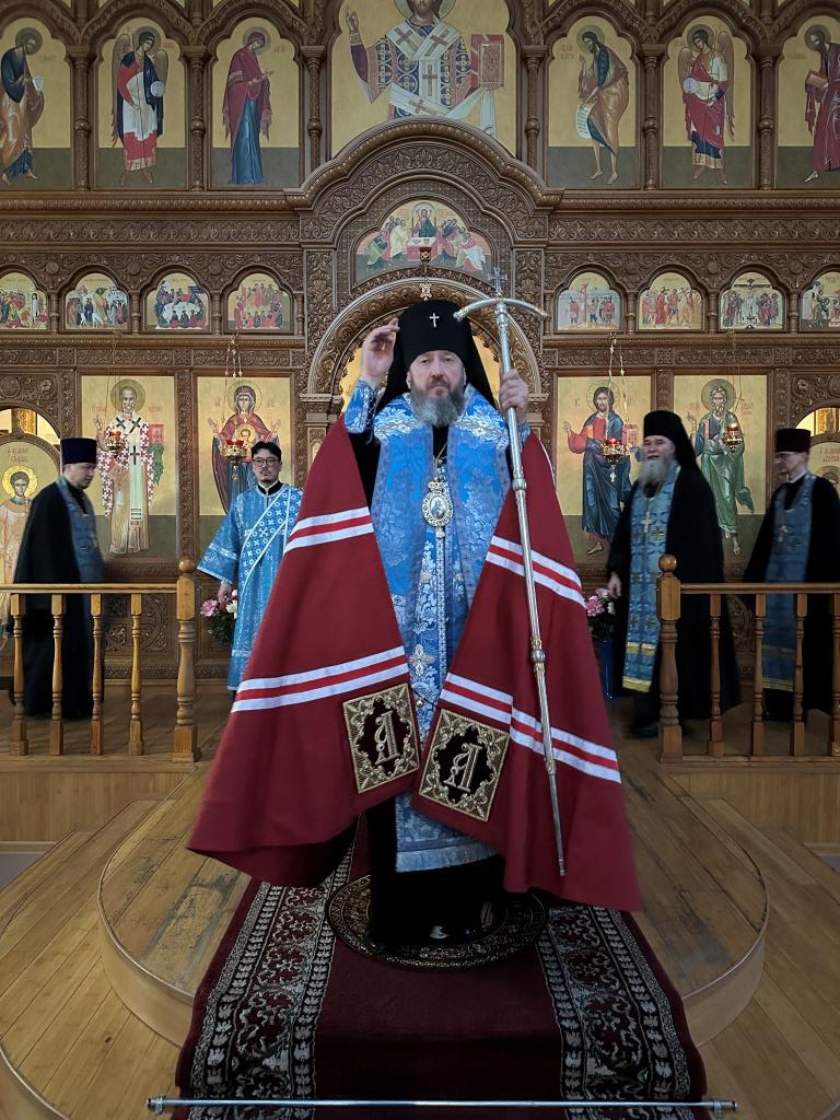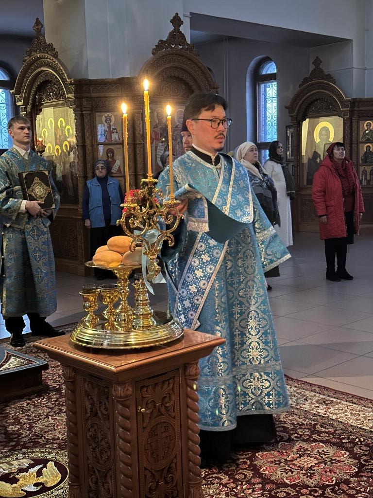 Владыке архиепископу сослужили: ключарь кафедрального собора иеромонах Никодим (Авдеев), клирики собора иерей Роман Подрезов, иерей Константин Дьяков; протодиакон Андрей Дудник, секретарь епархии диакон Илия Кван, диакон Кирилл Рамазанов. За праздничным богослужением совершалась лития – сугубо моление с освящением хлеба, пшеницы, вина и елея.