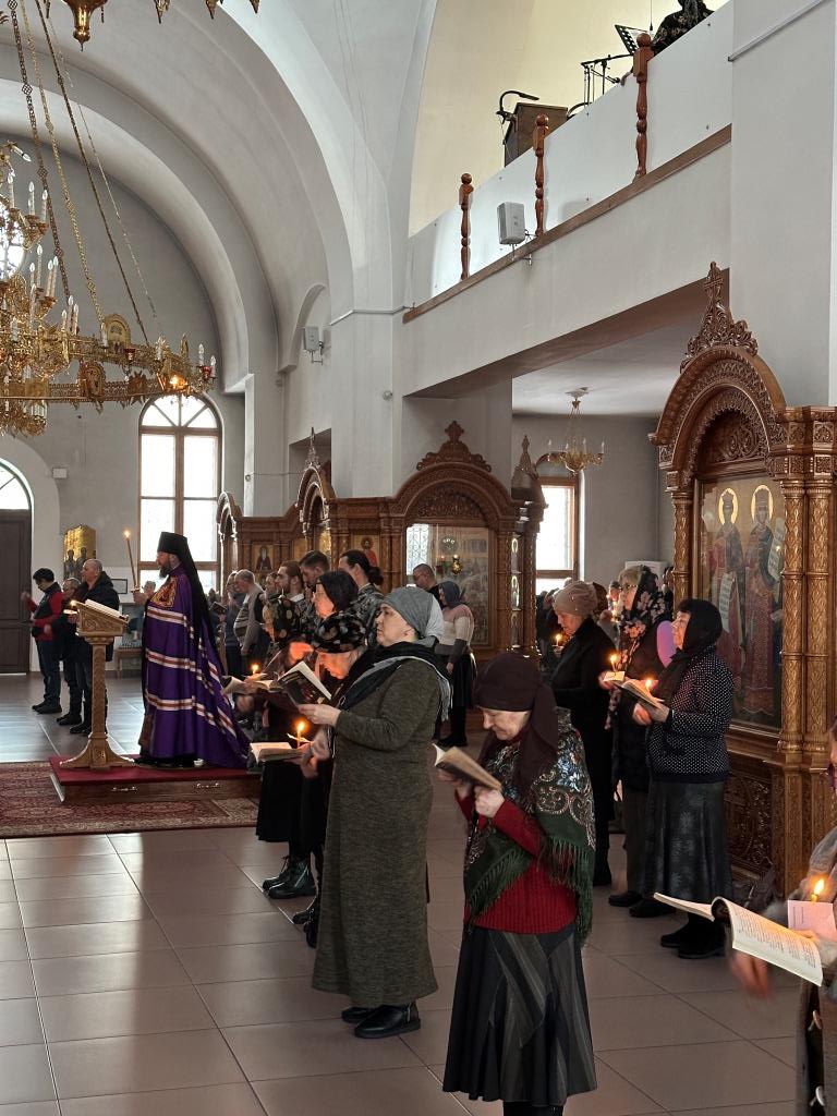 За богослужением молились клирики кафедрального собора, сотрудники епархиального управления, насельники Свято-Троицкого мужского монастыря города Усть-Каменогорска и прихожане Андреевского собора. Песнопения Великого повечерия и покаянного канона исполнял хор кафедрального собора под управлением регента Н. Романцовой.