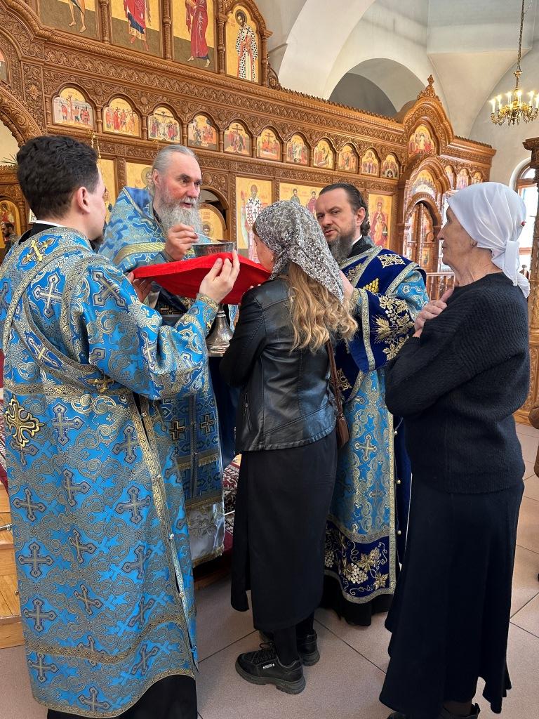 Его Высокопреосвященству сослужили: ключарь собора иеромонах Никодим (Авдеев), клирики главного храма епархии иерей Роман Подрезов и иеромонах Рафаил (Юстус); протодиакон Андрей Дудник, секретарь епархии диакон Илия Кван, диакон Кирилл Рамазанов. Хор под управлением регента Н. Романцовой исполнял песнопения праздника Благовещения и Божественной Литургии. В храме молились и причащались Христовых Таин прихожане и паломники кафедрального собора, сотрудники епархиального управления и насельники Свято-Троицкого мужского монастыря.