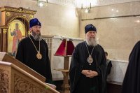 Главу Казахстанского Митрополичьего округа сопровождают: архиепископ Усть-Каменогорский и Семипалатинский Амфилохий, секретарь Митрополичьего округа, Заслуженный деятель искусств России О.Н. Овчинников, и.о. ректора Алма-Атинской православной духовной семинарии протоиерей Евгений Иванов, руководитель административного секретариата Главы Митрополичьего округа иерей Георгий Сидоров, руководитель службы митрополичьего протокола протодиакон Роман Головин, секретарь Усть-Каменогорской епархии диакон Илия Кван; сотрудники Алма-Атинского епархиального управления, ктиторы Митрополичьего округа.