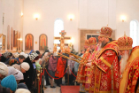 Во время Литургии на аналое в центре храма пребывал ковчег с Животворящим Древом Креста Христова, который по благословению Святейшего Патриарха Московского и всея Руси Кирилла и с согласия Священного Кинота Горы Афон с 26 сентября 2013 года посещает епархии Казахстанского Митрополичьего Округа.