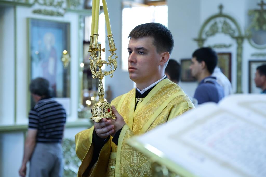 Его Преосвященству сослужили: духовник епархии архимандрит Спиридон (Теплухин), ключарь собора иеромонах Никодим (Авдеев), клирики храма иеромонах Севастиан (Андрющенко) и иерей Алексий Клепиков; протодиакон Георгий Засыпкин.