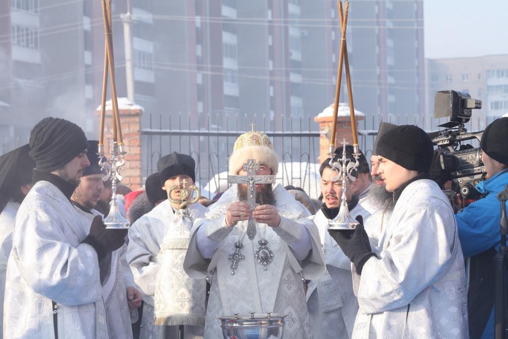 После заамвонной молитвы, при пении праздничных тропарей тропарей «Глас Господень на водах», прославляющих милость Божию к Своему творению, Архипастырь и священнослужители вышли из храма на соборную площадь, где в специально устроенной купели при большом стечении молящихся было совершено великое освящение воды. После освящения епископ Амфилохий окропил молящихся святой водой. По окончании Богослужения Архипастырь обратился к верующим со словами проповеди.