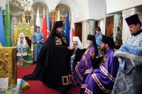 Его Святейшеству сослужили: митрополит Астанайский и Казахстанский Александр, управляющий делами Московской Патриархии, первый викарий Патриарха Московского и всея Руси по городу Москве митрополит Воскресенский Дионисий, архиепископ Усть-Каменогорский и Семипалатинский Амфилохий, епископ Видновский Тихон, епископ Серпуховской Роман, епископ Зарайский Константин.