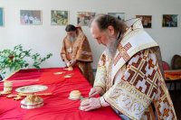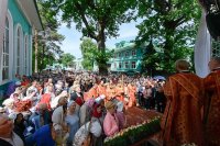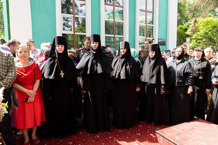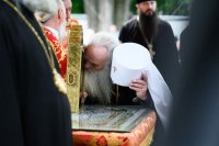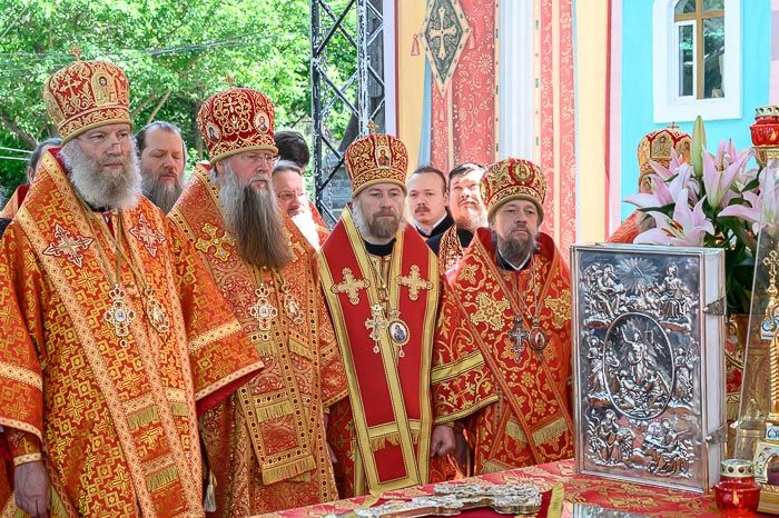 После чтения часов, перед началом Литургии, при пении пасхальных тропарей великая святыня – чудотворная икона Пресвятой Богородицы «Целительница» – была встречена у ворот храма, перенесена крестным ходом к месту совершения богослужения и установлена на престоле.
