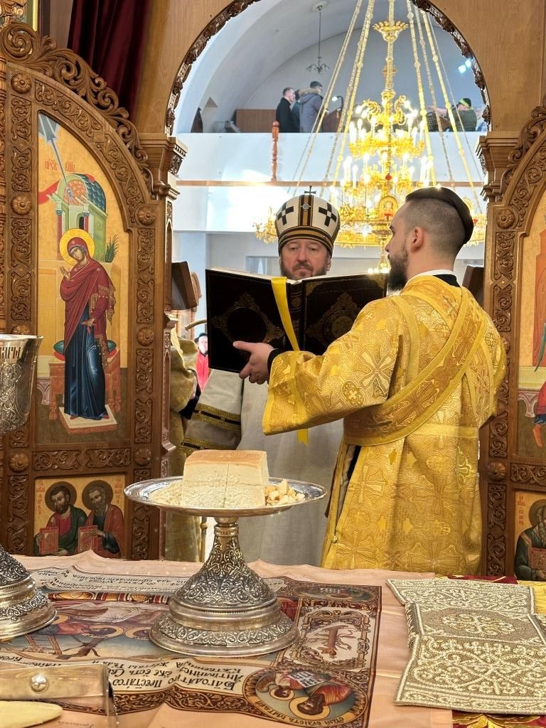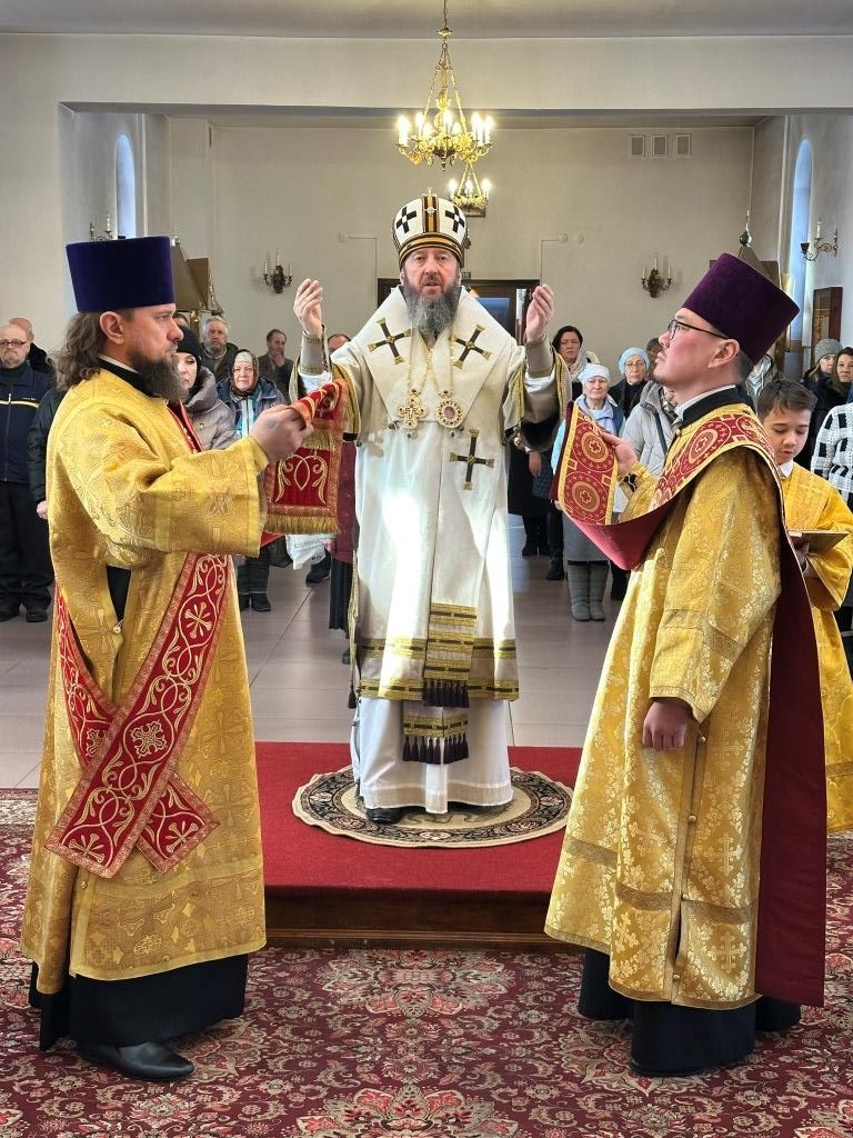 Его Высокопреосвященству сослужили: ключарь кафедрального собора иеромонах Никодим (Авдеев), клирики собора иерей Виталий Адаменков и иерей Роман Подрезов, протодиакон Андрей Дудник, секретарь епархии диакон Илия Кван.