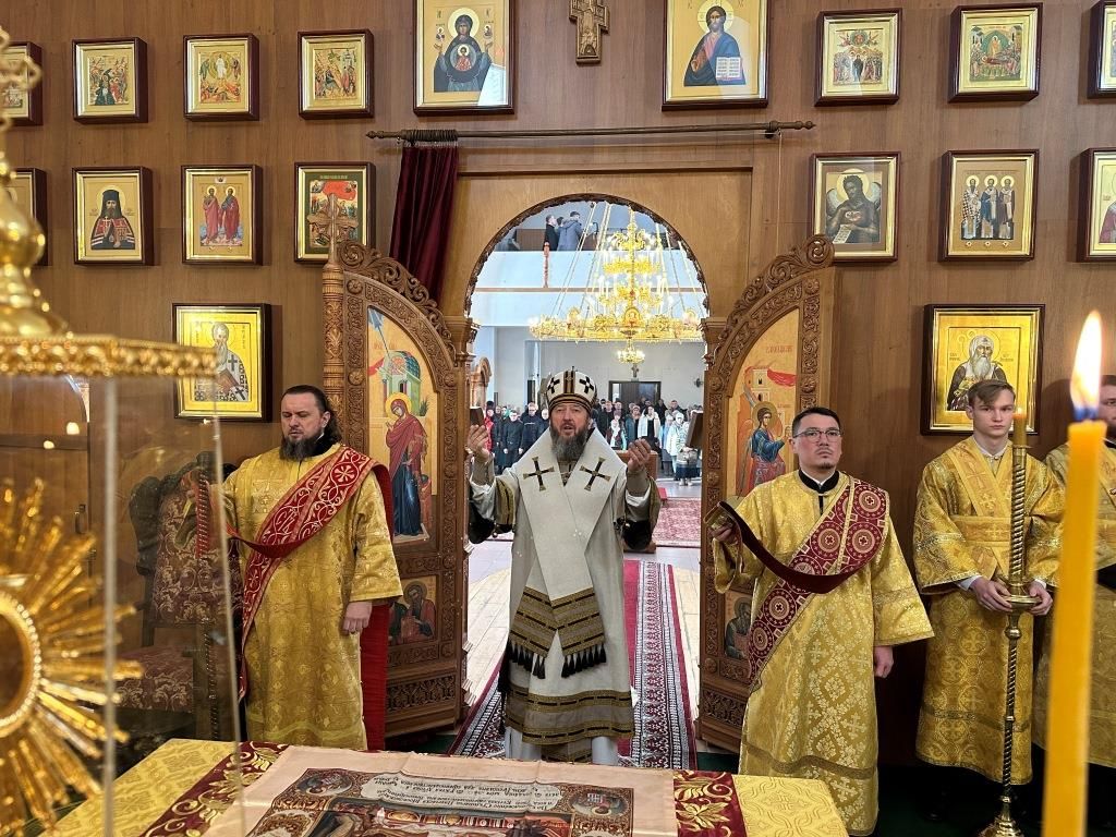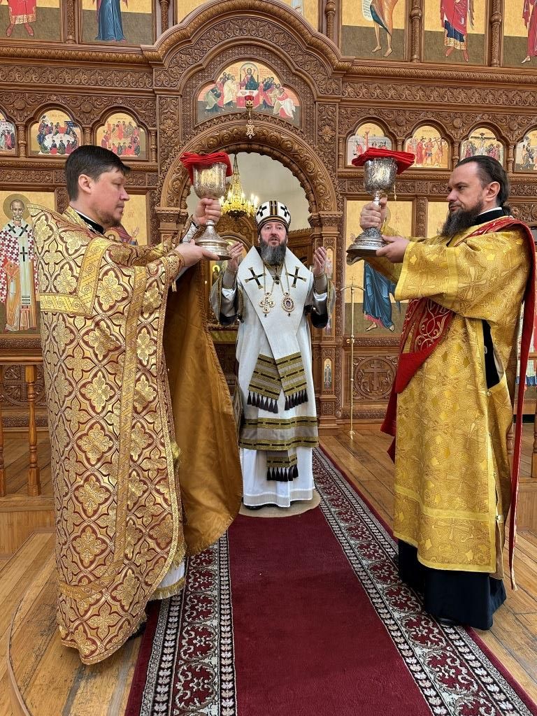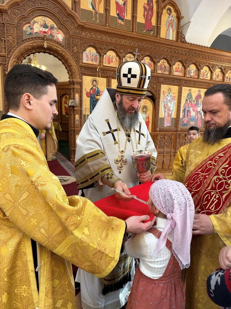 Хор Андреевского собора под управлением регента Н. Романцовой исполнял богослужебные песнопения. Перед причастием мирян проповедовал священник Виталий Адаменков. За воскресным богослужением молились и причащались Святых Христовых Таин прихожане кафедрального собора, насельники Свято-Троицкого мужского монастыря города Усть-Каменогорска, сотрудники епархиального управления и воспитанники Центральной воскресной школы.