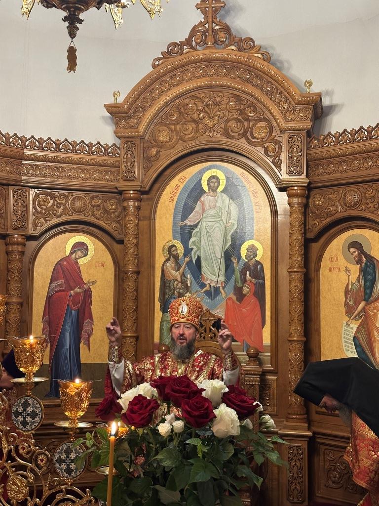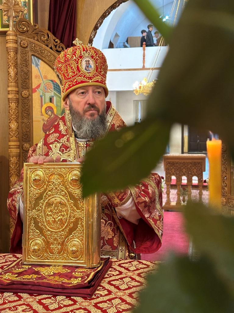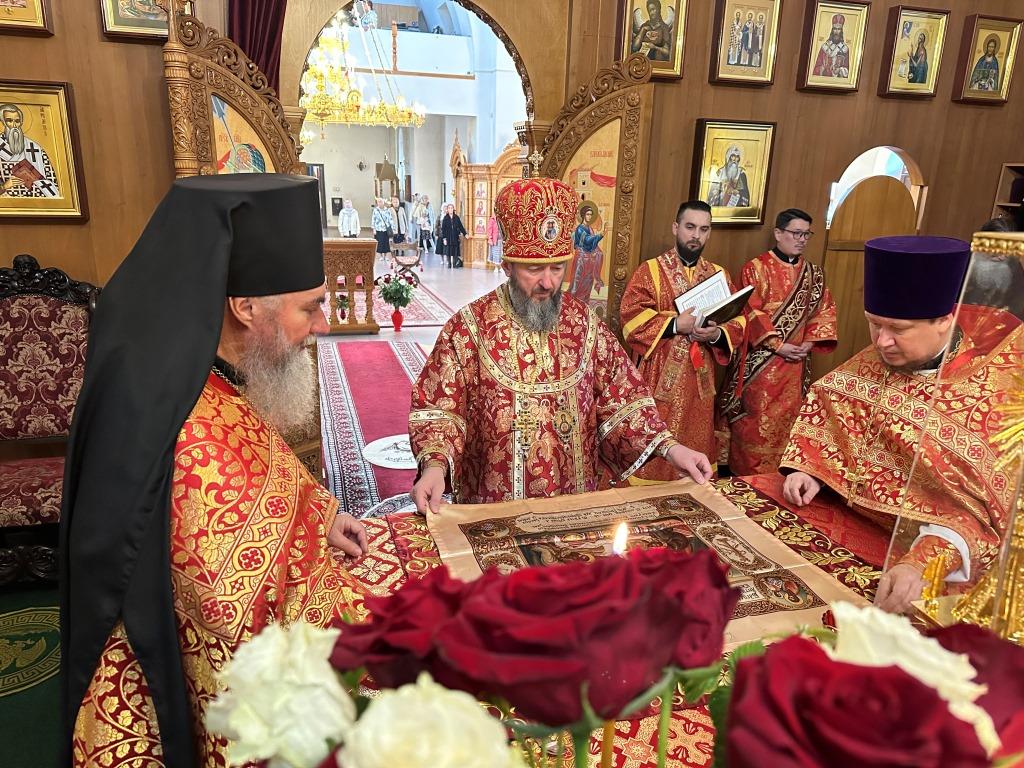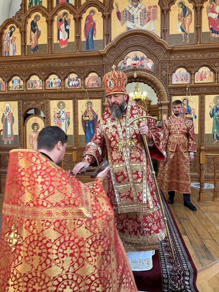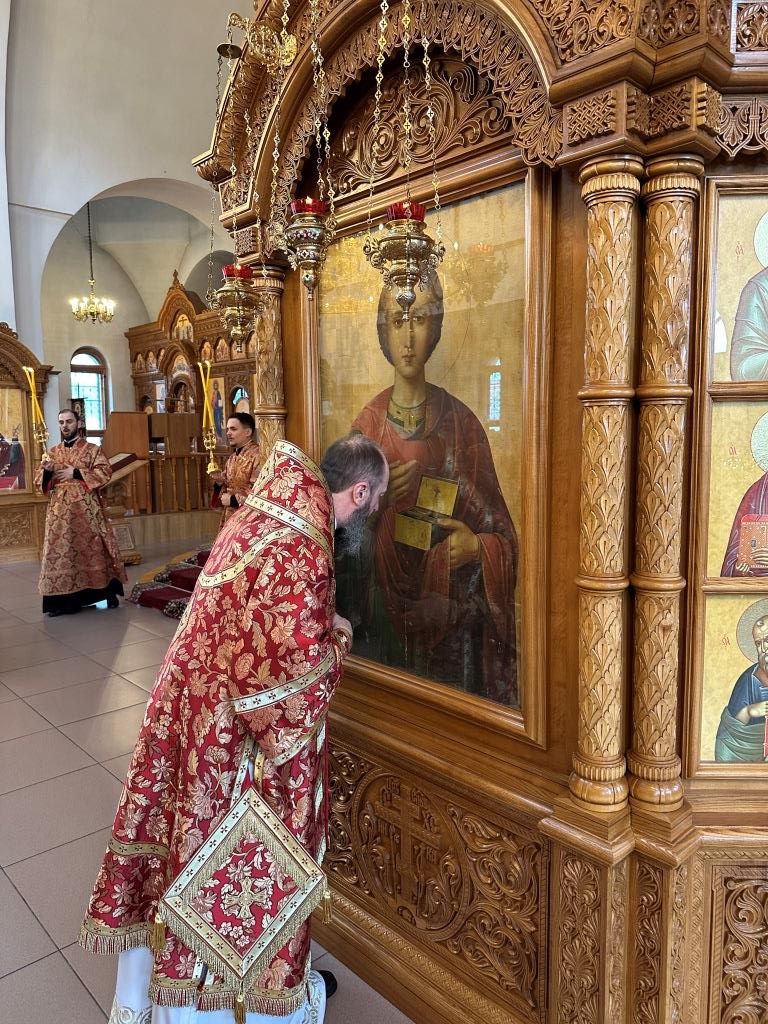 После заамвонной молитвы было совершено славление великомученику Пантелеимону перед его почитаемой старинной иконой. По окончании богослужения архиепископ Амфилохий поздравил прихожан и причастников с принятием Святых Христовых Таин и обратился к народу Божию с Архипастырским словом.